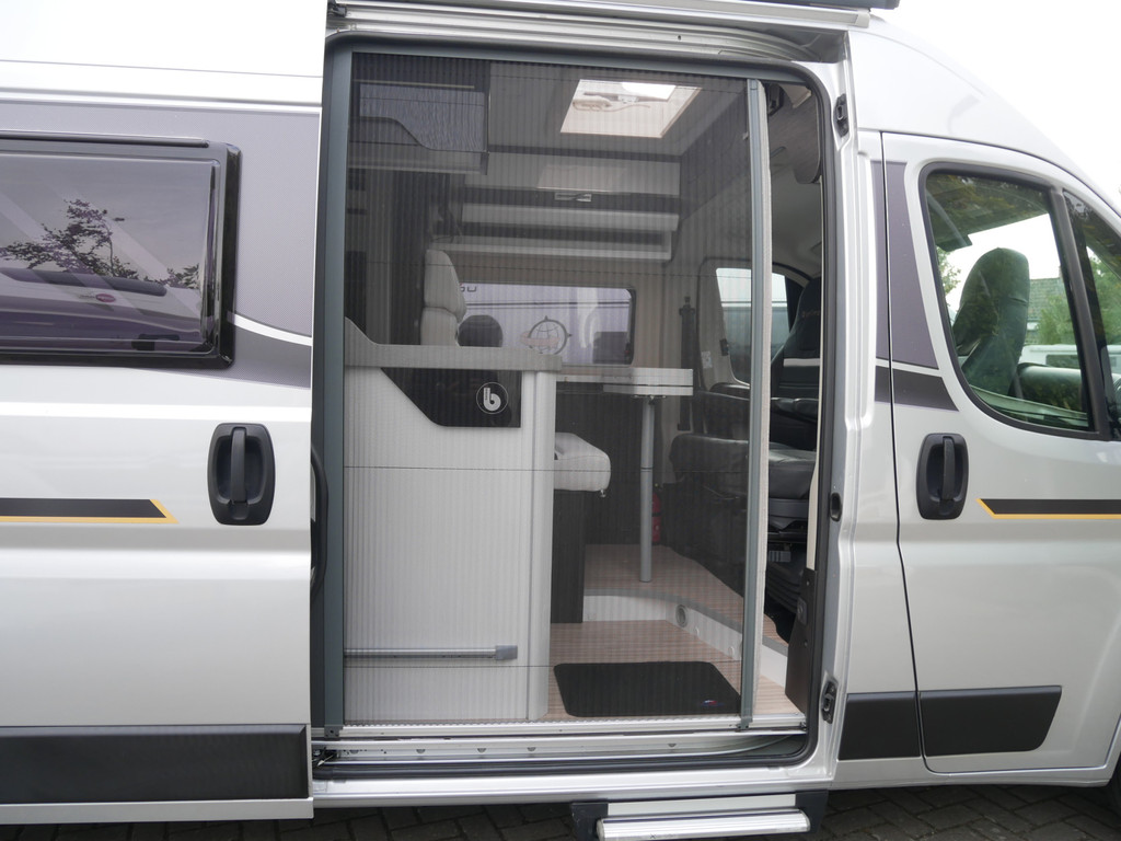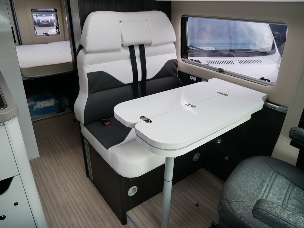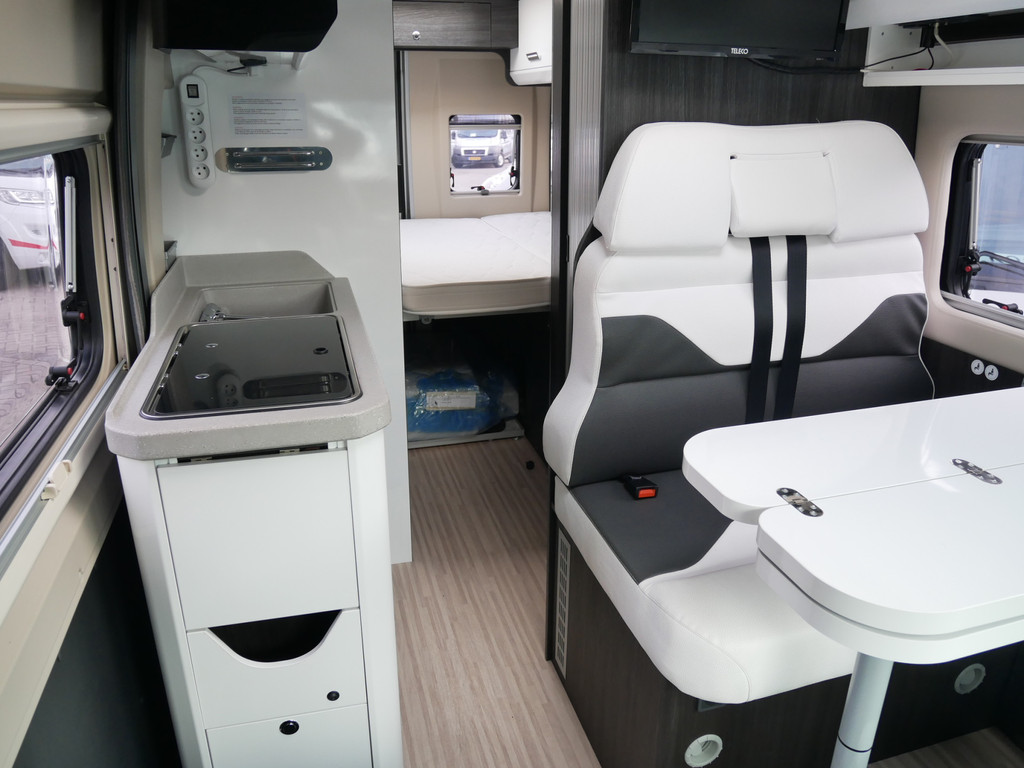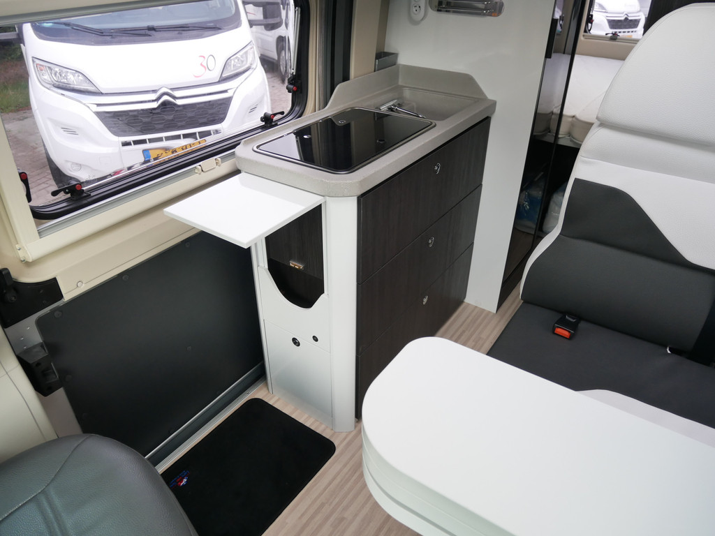 De camper is onder andere voorzien van een mooie afwerking met luxe lederen bekleding, keuken met 2 pits kooktoestel, dwarsbed, cruise control, Truma kachel op diesel, boiler op diesel, XXL koelkast met groente la, modern en licht ogende tinten in het interieur, wasbak, motorairco, zeer veel opbergmogelijkheden door de vele bovenkasten, toiletruimte met doucheruimte, treinzit met opklapbare tafel,, radio/cd/mp-3 speler, bluetooth en verduistering rondom.