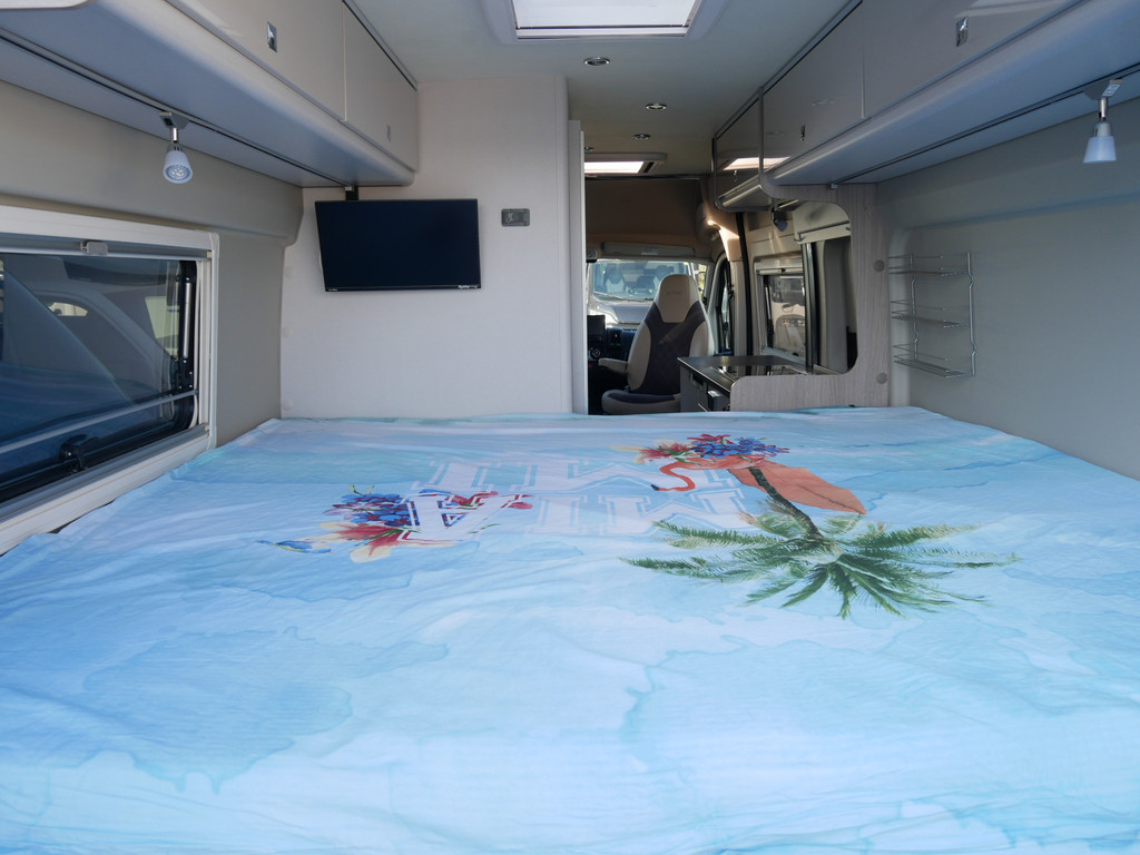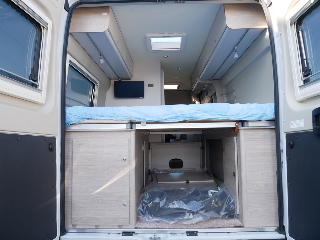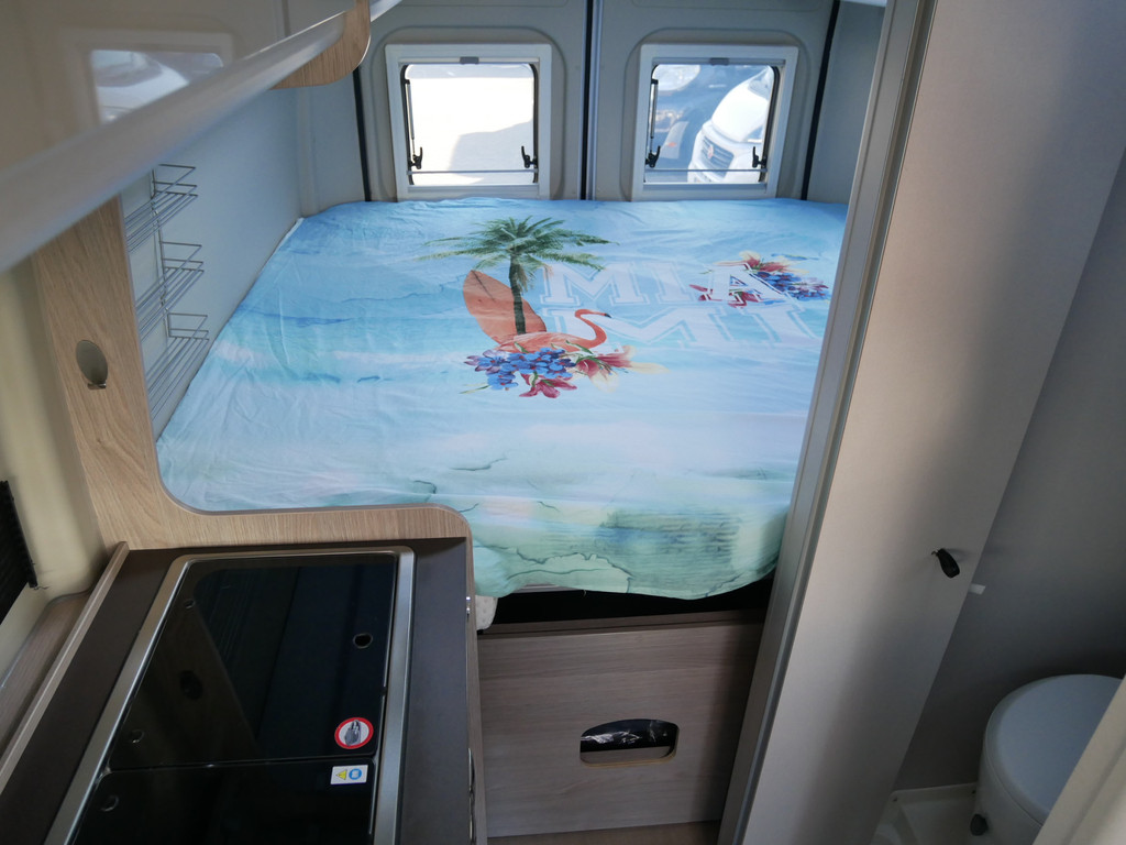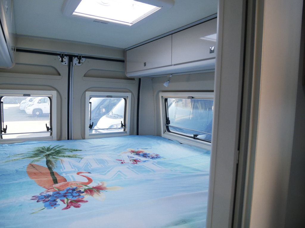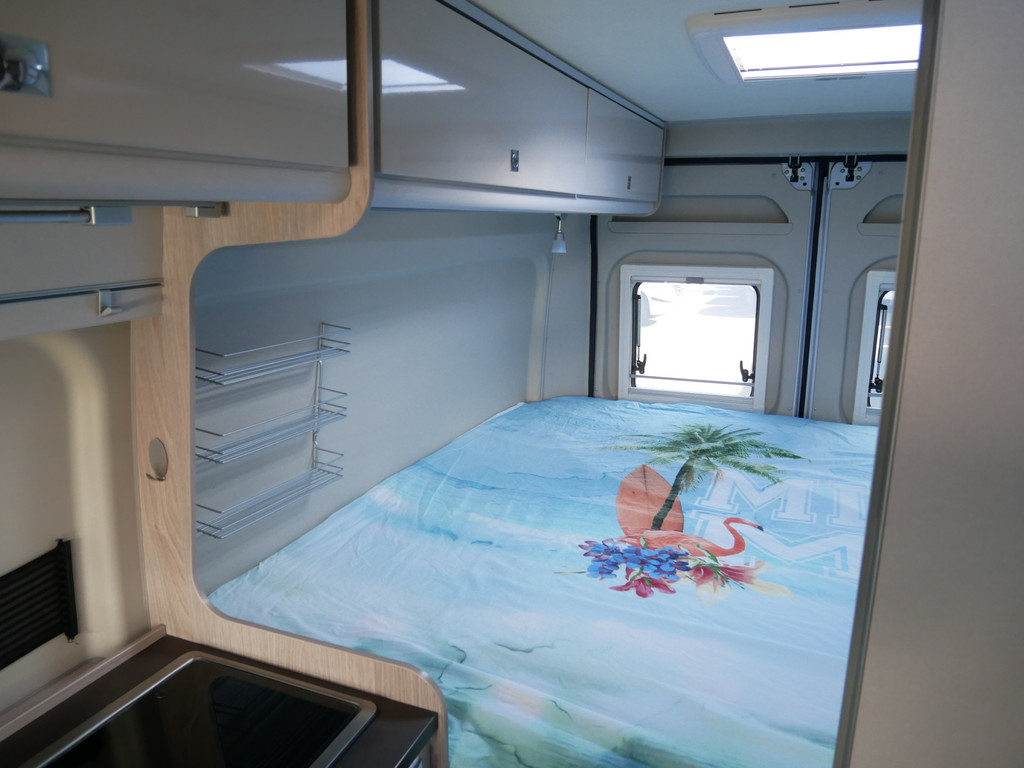 Maten: De camper heeft een stahoogte van 189 cm, lengtebedden links: 185 x 90 cm, rechts: 195 x 90 cm .
