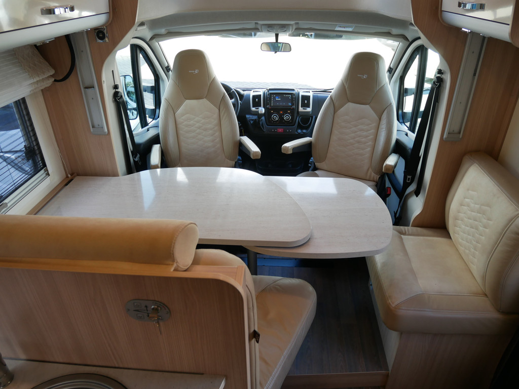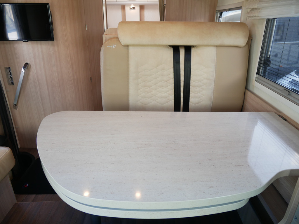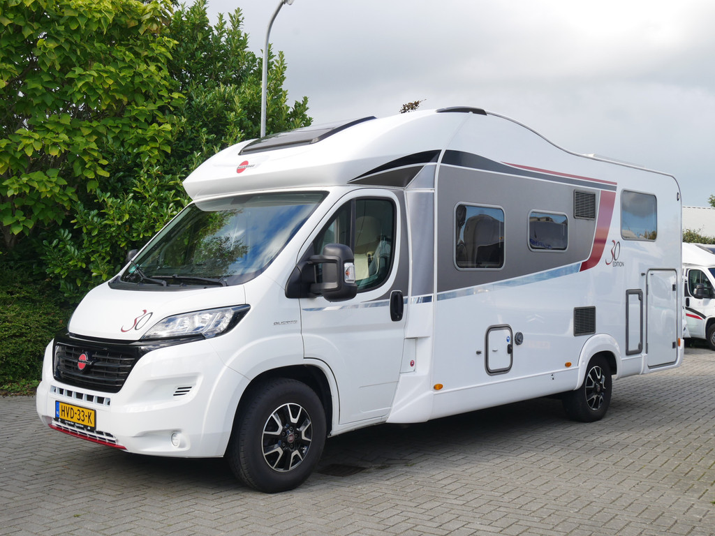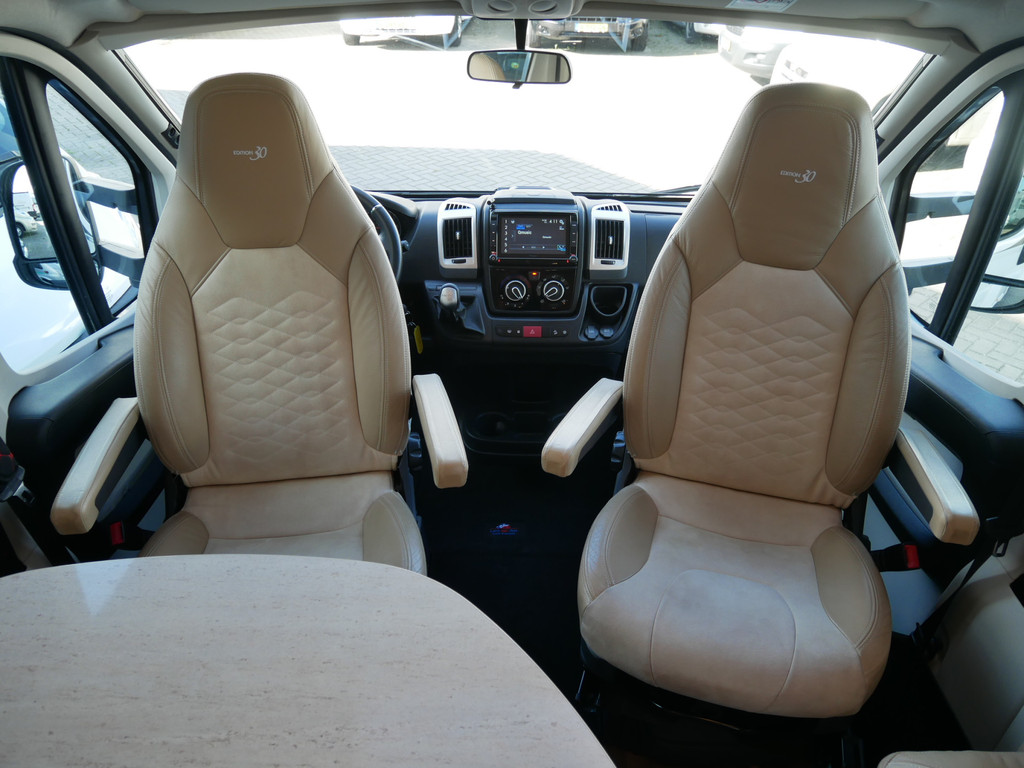 De camper is onder andere voorzien van een mooie en luxe afwerking met de speciale '30 Edition stoelen in creme half leder en moderne look in het interieur, ruime keuken met 3 pits kooktoestel, lengtebedden, elektrisch hefbed, wasbak, hordeur entree, brede deurentree, motorairco, zeer veel opbergmogelijkheden door de vele bovenkasten en de grote kast ruimtes, ruime toiletruimte, slimme douche ruimte, een ruime rondzit met grote verschuifbare tafel en een royale XXL garage met een grote deur rechts en links (105 X 80 cm) zodat fietsen in 1x geplaatst kunnen worden.