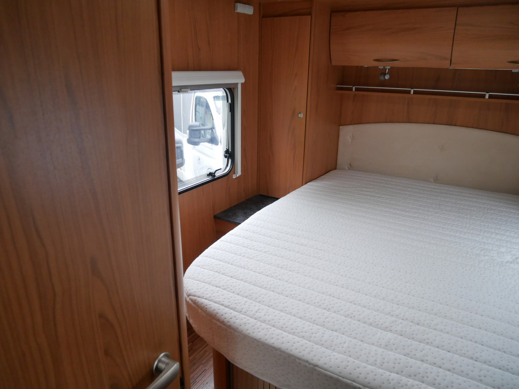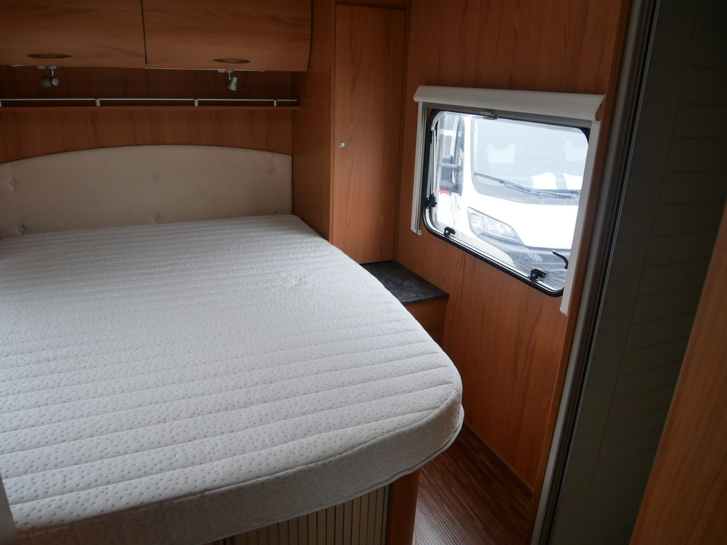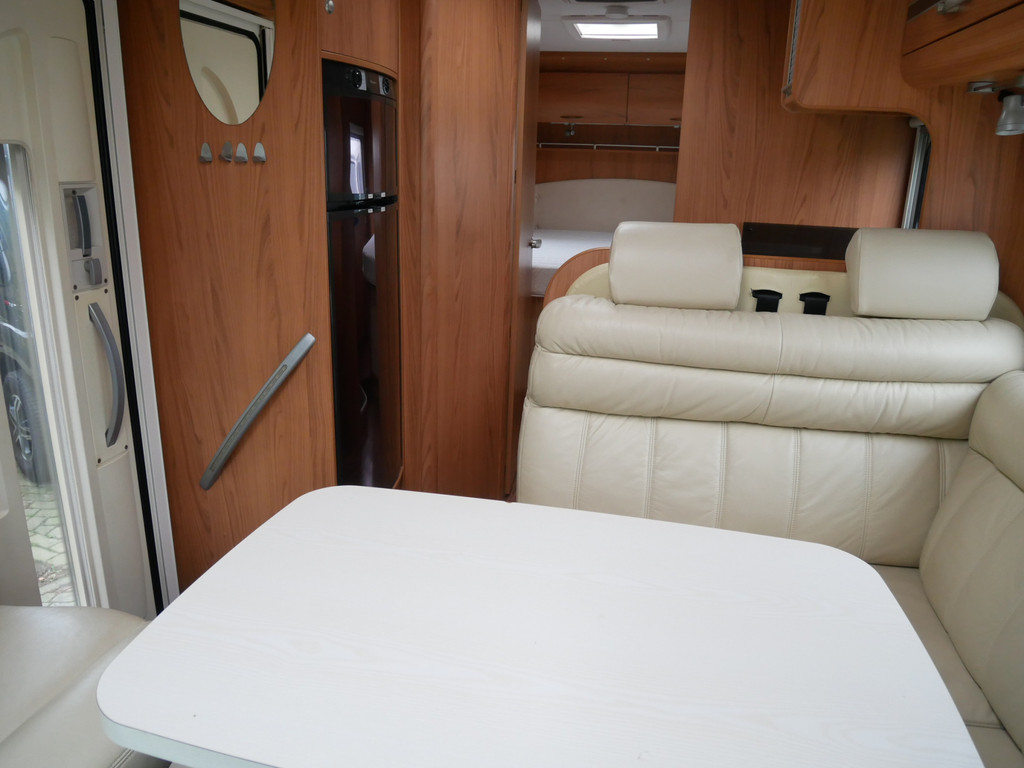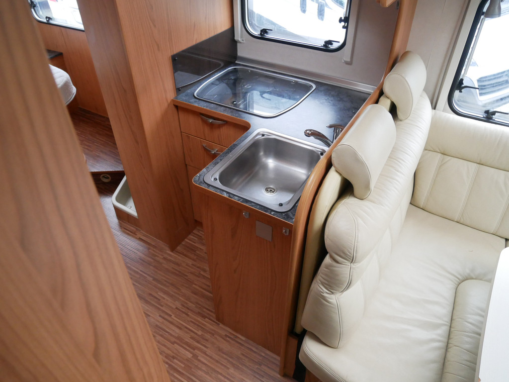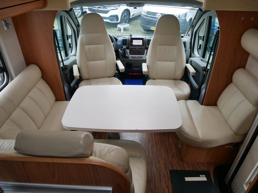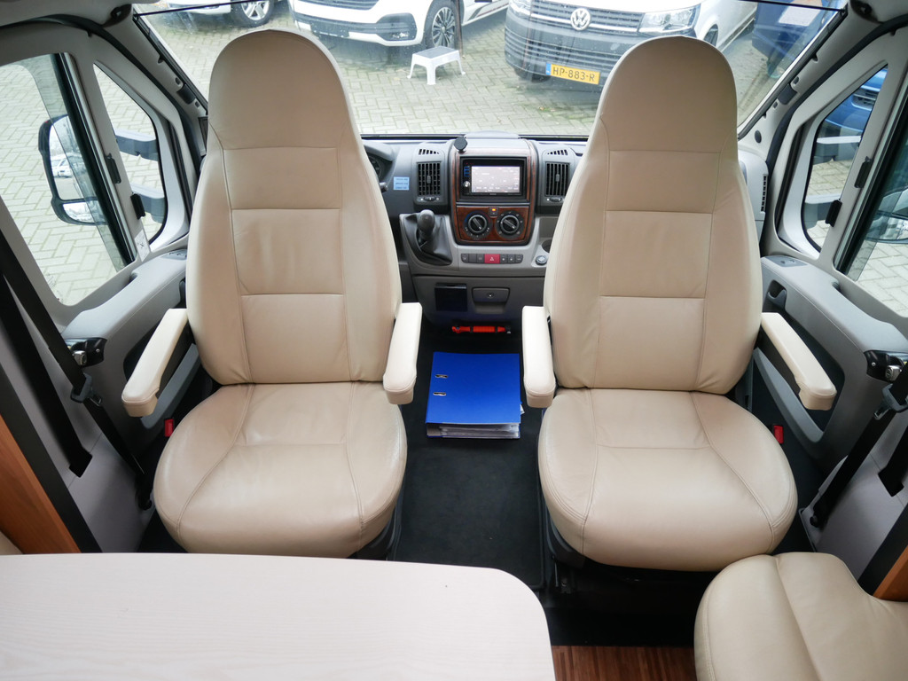 De camper is onder andere voorzien van luxe stoffen bekleding, mooie en lichte houtkleuren, ruime keuken met 3 pits kooktoestel, wasbak, motorairco, queensbed, dubbelglas ramen, zeer veel opbergmogelijkheden door de vele kasten en slimme opbergvakken, aparte douche, toiletruimte, een ruime rondzit met tafel en een garageluik rechts onder het queensbed.