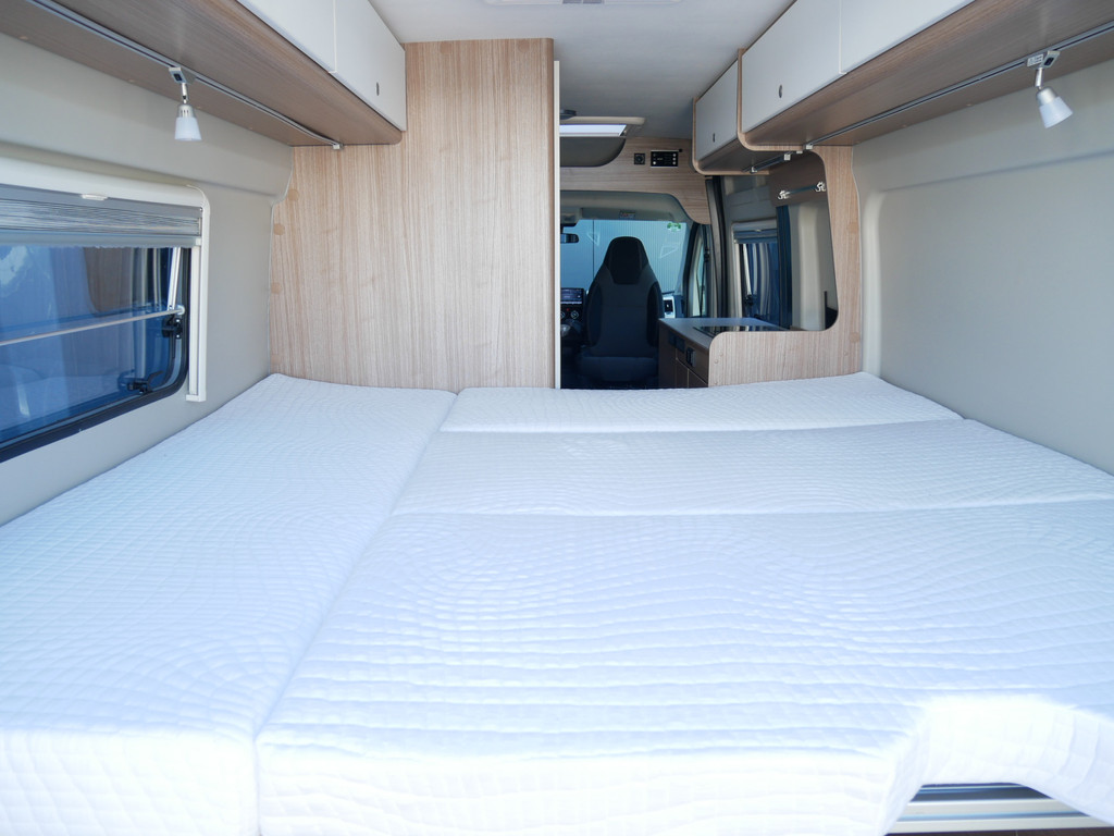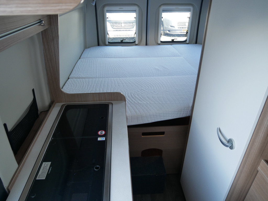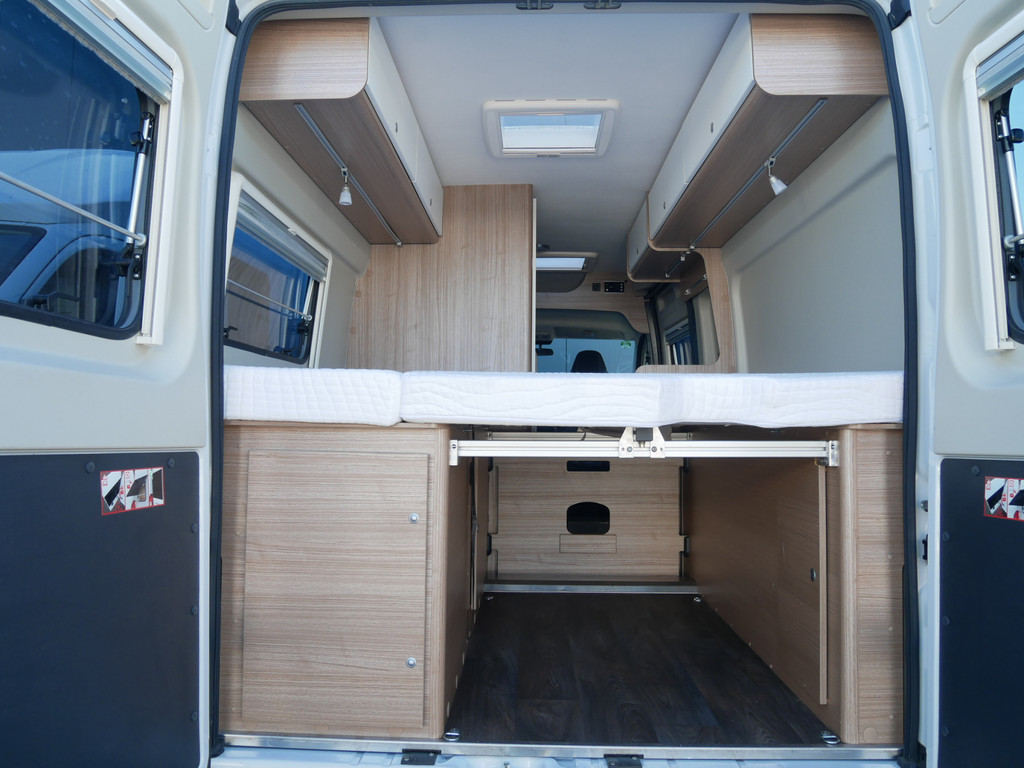 Maten: de camper heeft een stahoogte van 189 cm, lengtebedden links: 190 X 97 cm, rechts: 185 X 97 cm, volledige breedte: 195 cm.