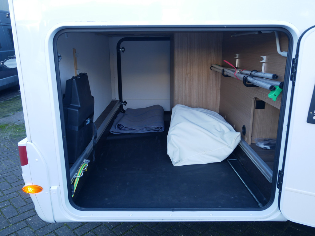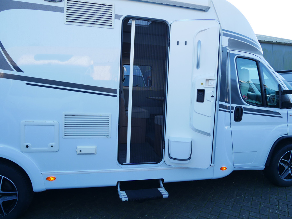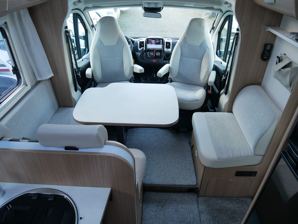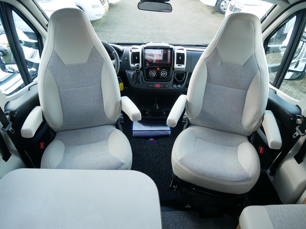 De camper is onder andere voorzien van een mooie en luxe afwerking met half lederen stoelen, moderne houtlook in het interieur, 9-Traps automaat, Truma combiketel op gas (verwarming en warm water), luxe ruime keuken met 3 pits kooktoestel, hordeur, elektrische opstap, wasbak, motorairco, zeer veel opbergmogelijkheden in de vele bovenkasten en de grote kast ruimtes, ruime toiletruimte, doucheruimte, scheidingswand slaapkamer / leefgedeelte, grote koelkast met vriesvak, een rondzit met grote tafel en fijne lange bank, garage onder het queensbed met 2 garagedeuren en een cassetteluifel.