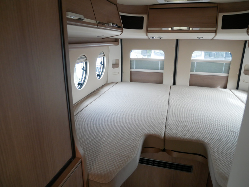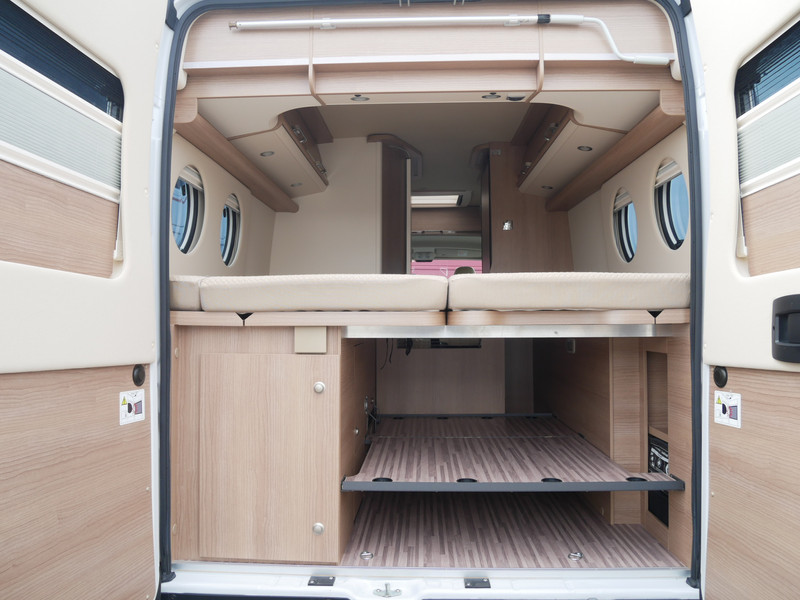Maten: De camper heeft een stahoogte van 188 cm en de lengte bedden links: 195 X 100 cm, rechts: 185 X 100 cm en volle breedte met tussenstuk: 195 cm.