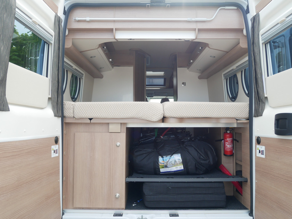 Maten: De camper heeft een stahoogte van 188 cm en de lengte bedden links: 195 X 100 cm, rechts: 185 X 100 cm en volle breedte met tussenstuk: 195 cm.