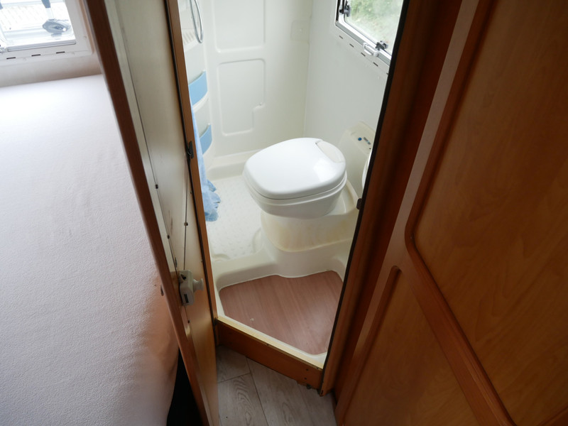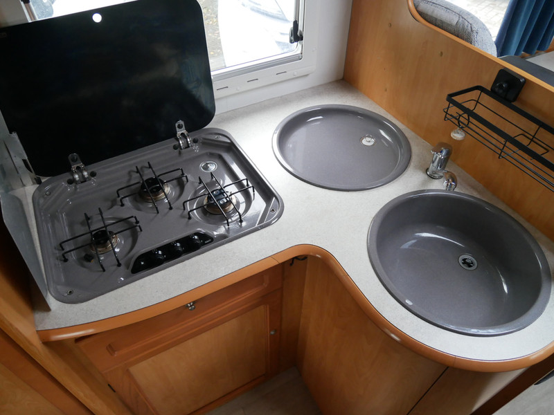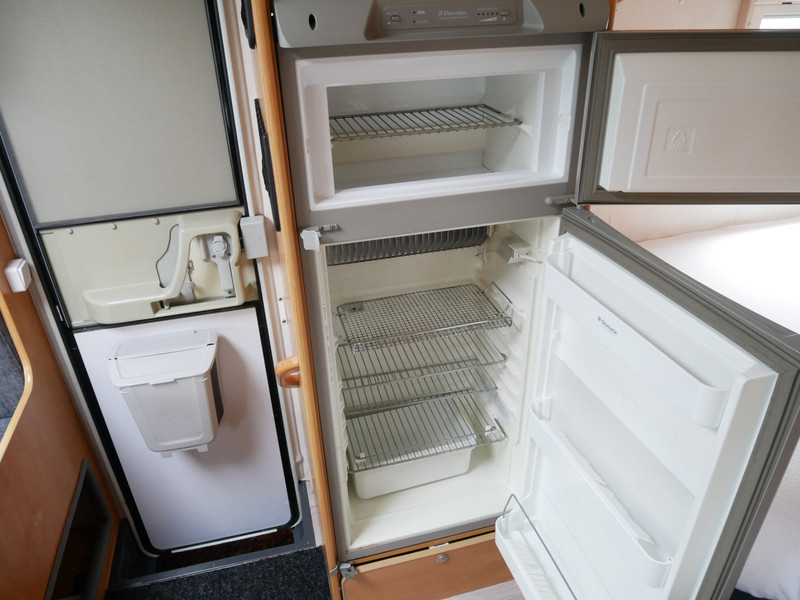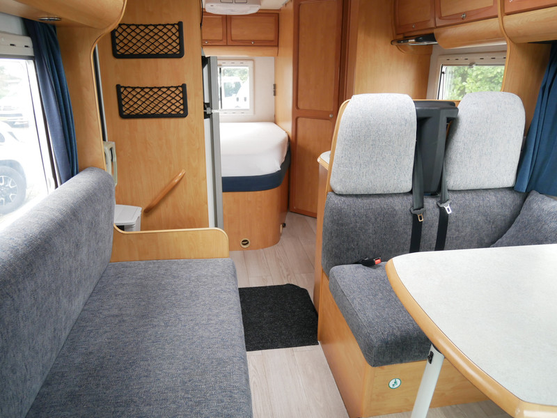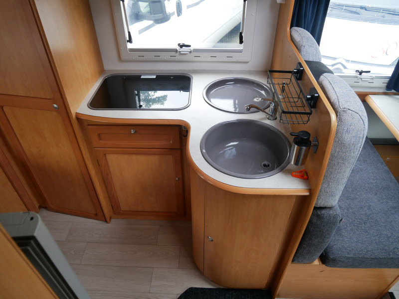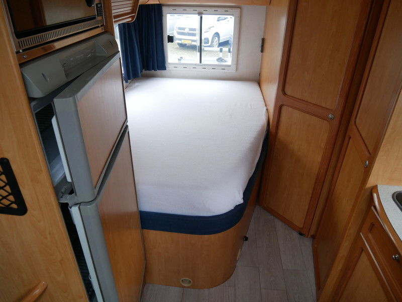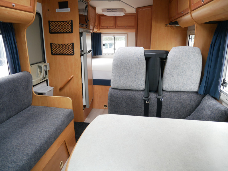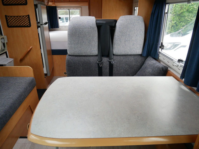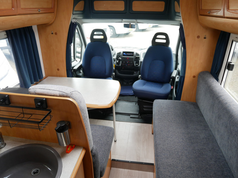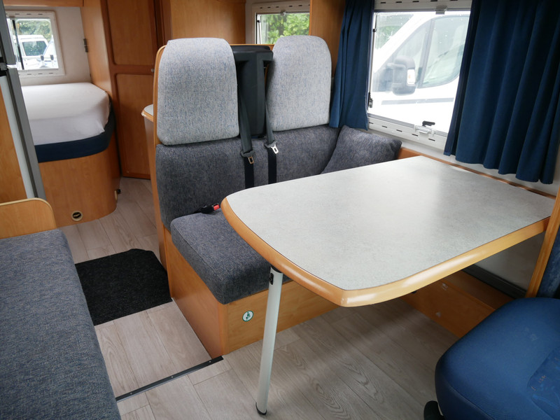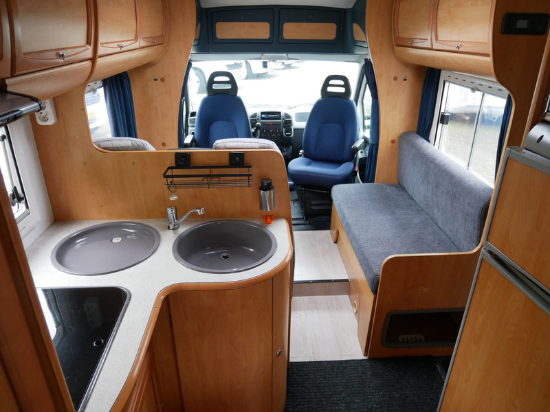 De camper is onder andere voorzien van een afwerking met stoffen bekleding, airco, houten interieur, fransbed links achterin, toilet en doucheruimte zijn gezamenlijk rechts achterin, voorin een halve treinzit met 2 draaistoelen en een dwarsbankje, ruime keuken met 3 pits kooktoestel, radio/cd/mp-3 speler, wasbak, koelkast, veel opbergmogelijkheden door de vele bovenkasten en de grote kast ruimtes en mooie garage onder het fransbed.