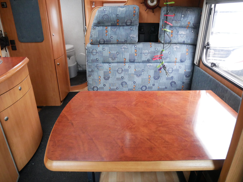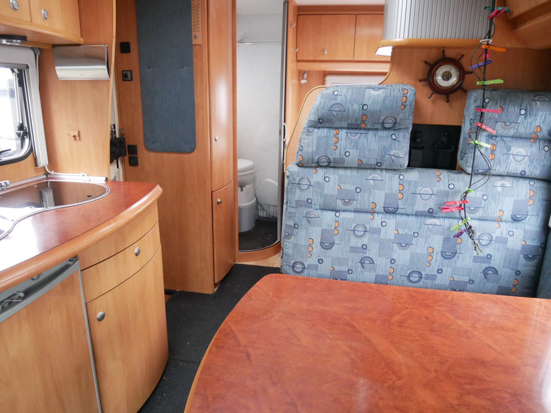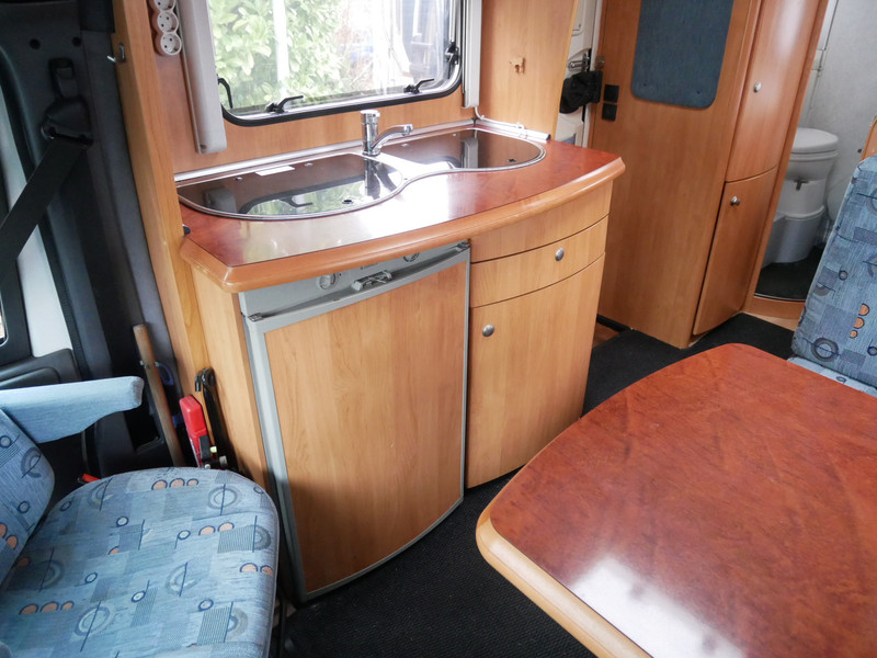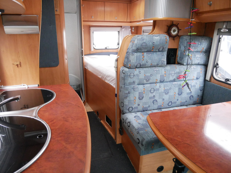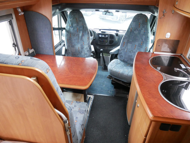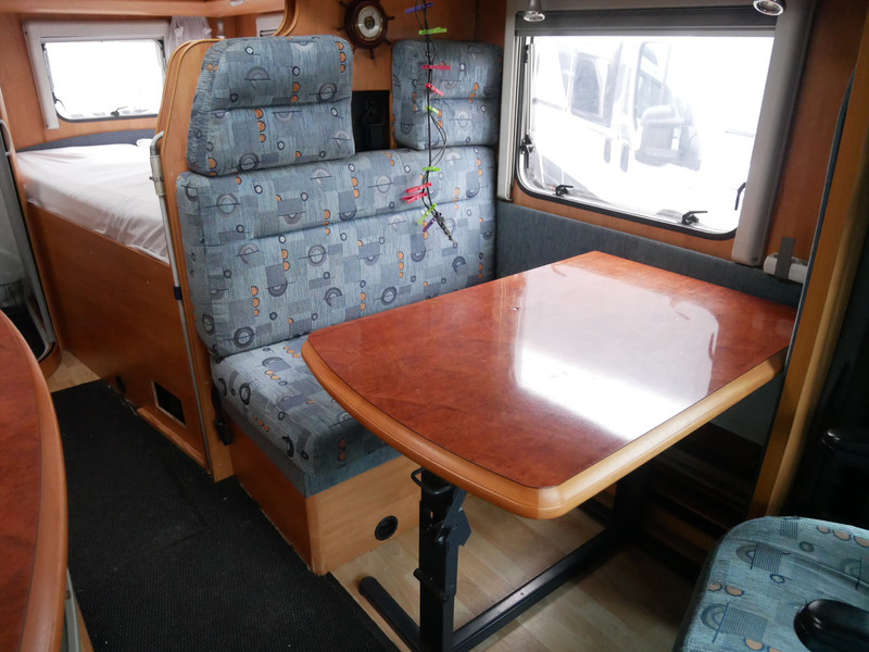 De camper is onder andere voorzien van 2 slaapplaatsen in het fransbed, keukenblok met wasbak en gastoestel, treinzit met bank, draaibare voorstoelen, koelkast, kachel, boiler, radio/cd/mp-3 speler, garage en trekhaak.