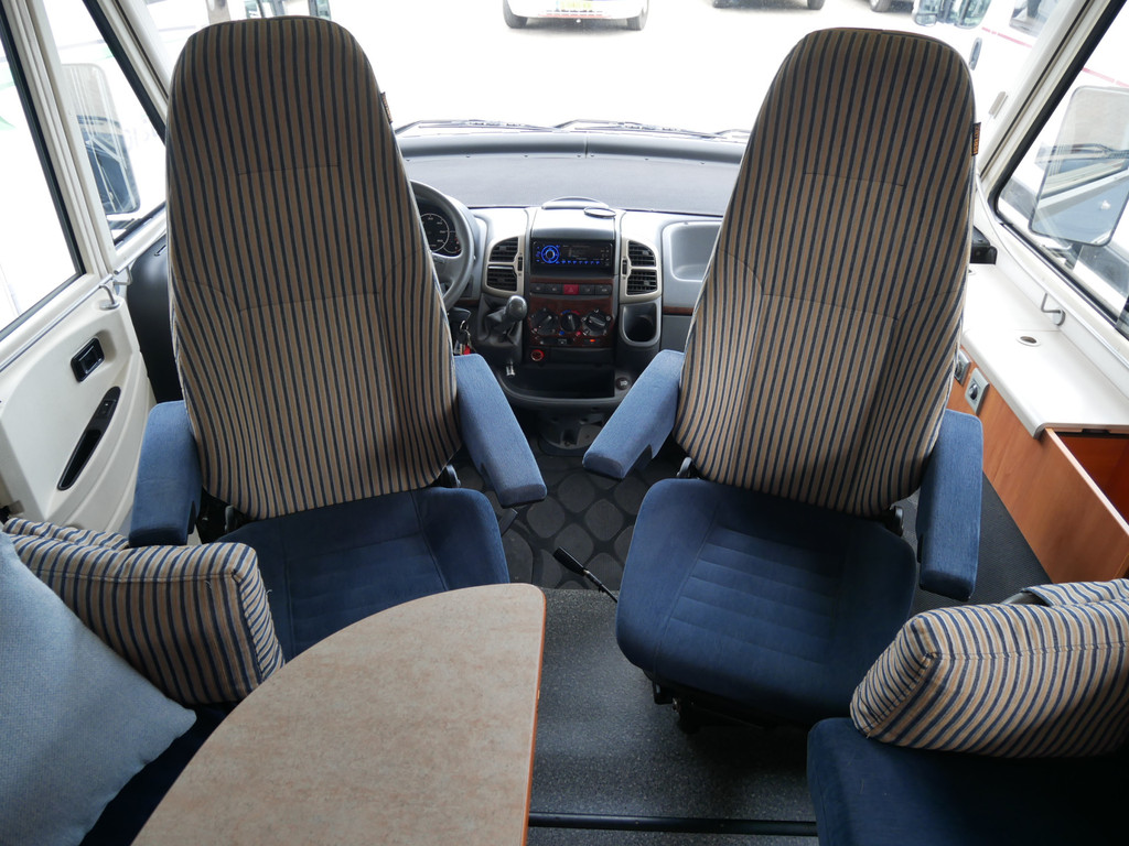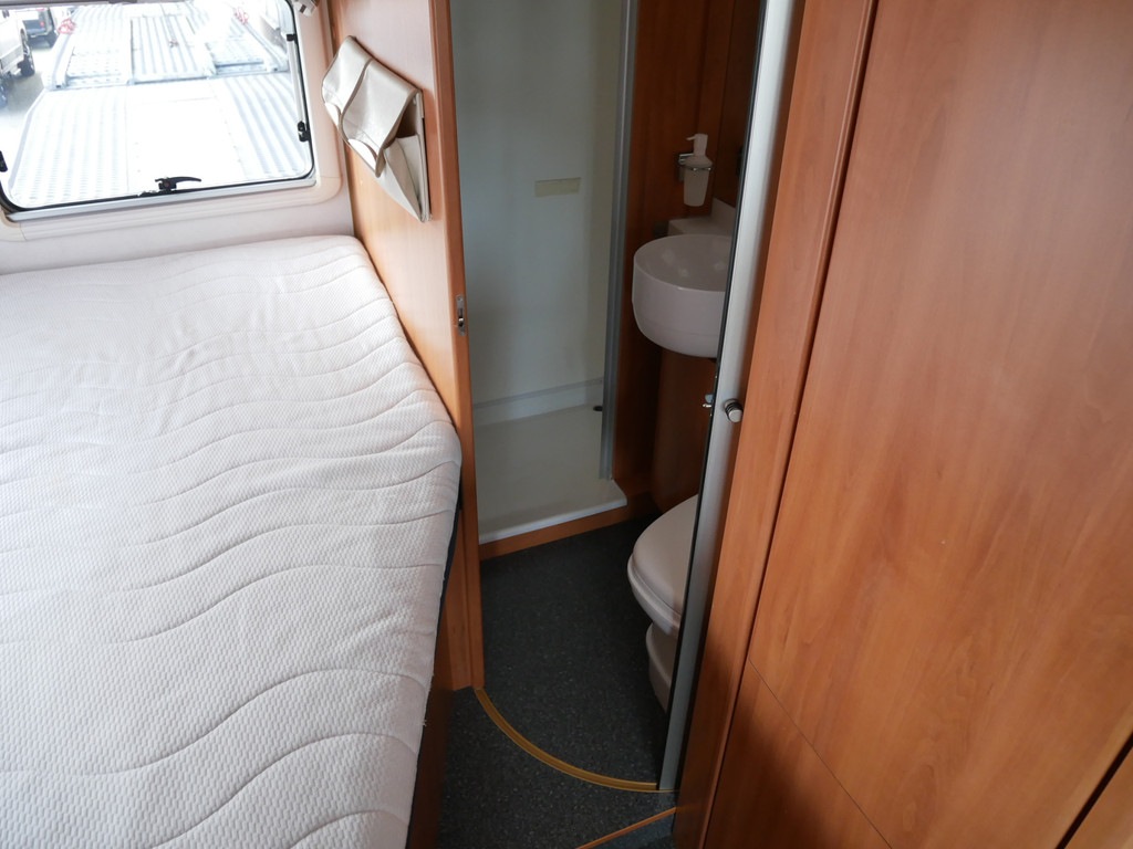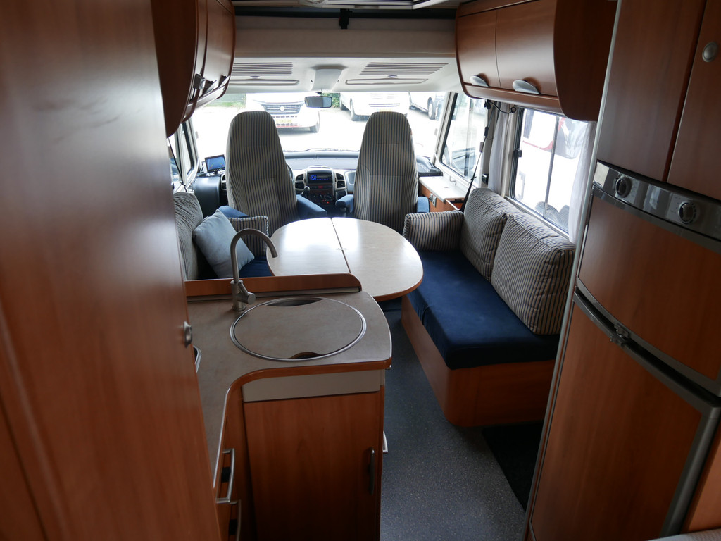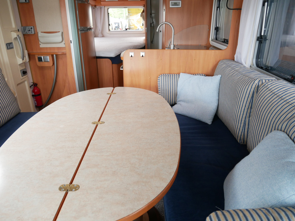 De camper is onder andere voorzien van een nette afwerking met zachte stoffen bekleding en luxe ogende houttinten in het interieur, ruime keuken met 3 pits kooktoestel, fransbed, hefbed, wasbak, hordeur entree, motorairco, cruise control, zeer veel opbergmogelijkheden in de vele bovenkasten en de grote kast ruimtes, ruime toiletruimte, douche ruimte, een ruime face-to-face zit met grote tafel en een garage met serviceluik aan de rechter buitenzijde.