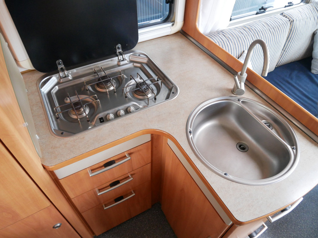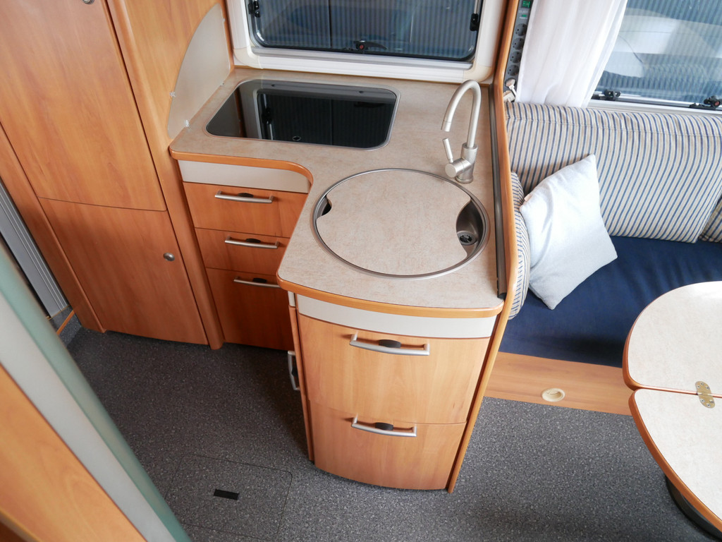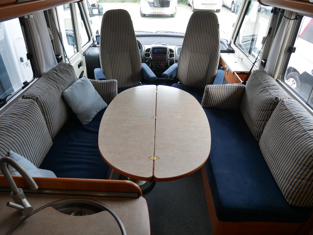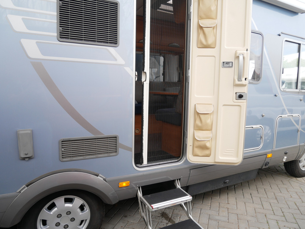 De camper is onder andere voorzien van een nette afwerking met zachte stoffen bekleding en luxe ogende houttinten in het interieur, ruime keuken met 3 pits kooktoestel, fransbed, hefbed, wasbak, hordeur entree, motorairco, cruise control, zeer veel opbergmogelijkheden in de vele bovenkasten en de grote kast ruimtes, ruime toiletruimte, douche ruimte, een ruime face-to-face zit met grote tafel en een garage met serviceluik aan de rechter buitenzijde.