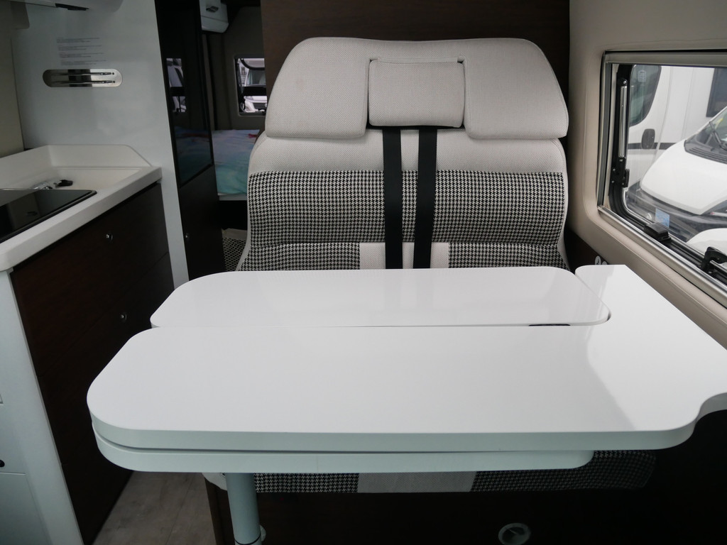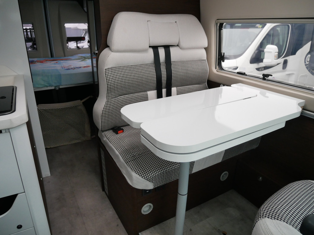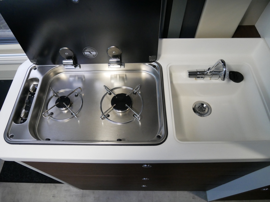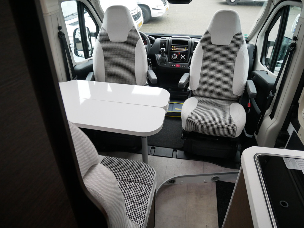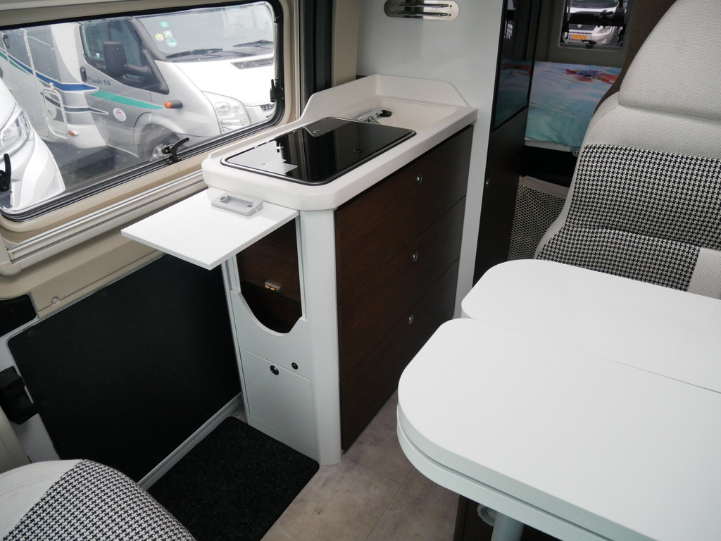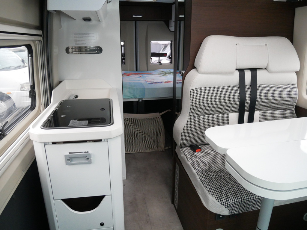 Verder zijn ook aanwezig; een prachtige keuken met 2 pits kooktoestel, wasbak, dwarsbed, parkeersensoren achter,, modern en luxe ogende wit en lichte houttinten in het interieur, zeer veel opbergmogelijkheden door de vele bovenkasten, toiletruimte met douche, een ruime zit met een tafel die kan worden opgevouwen voor ruimtebesparing, zonnepaneel en een fietsenrek