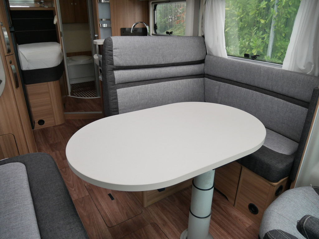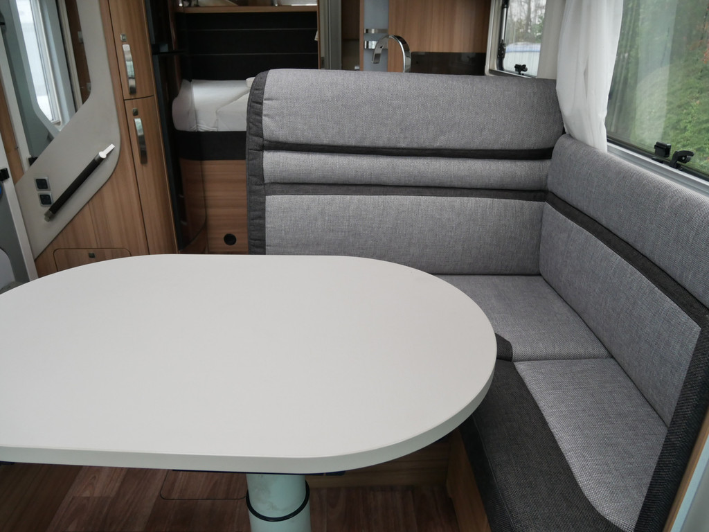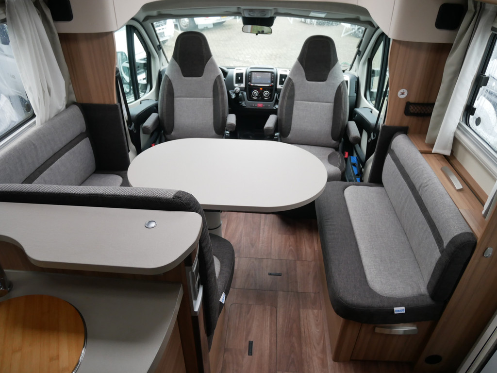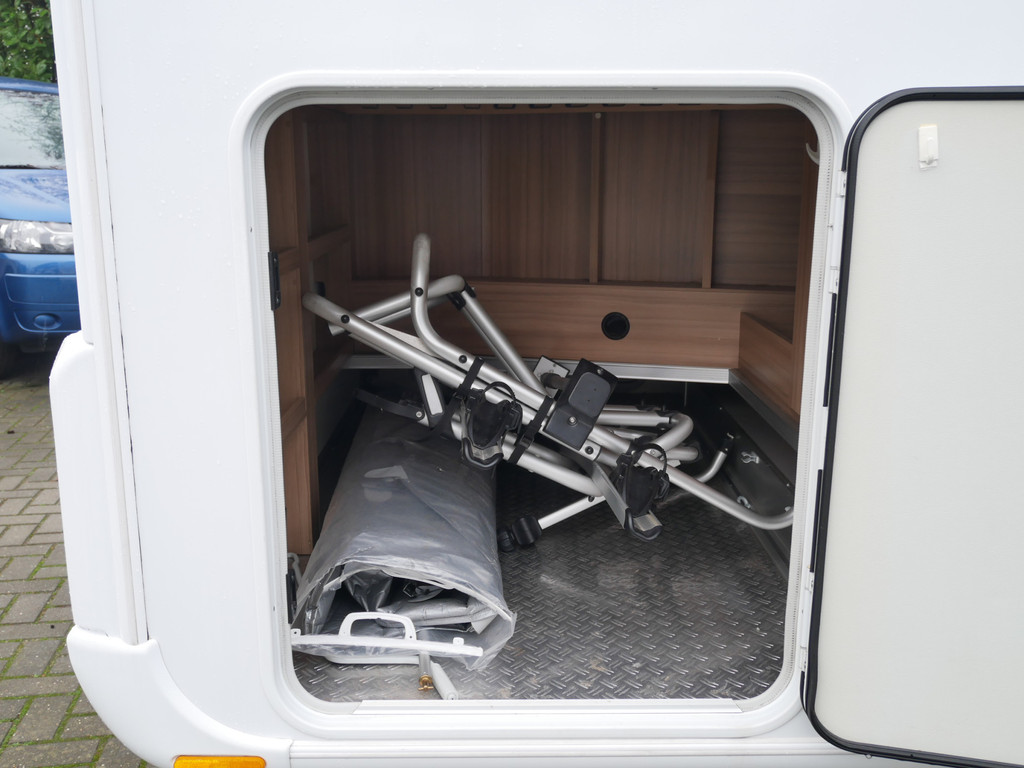 De camper is onder andere voorzien van een mooie en luxe afwerking met stoffen stoelen, moderne houtlook in het interieur, cassette luifel, Truma combiketel op gas, luxe ruime keuken met 3 pits kooktoestel, centrale deurvergrendeling met afstandsbediening, elektrische opstap, wasbak, motorairco, zeer veel opbergmogelijkheden in de vele bovenkasten en de grote kast ruimtes, ruime toiletruimte met douche, grote koelkast met vriesvak, een rondzit met grote verschuifbare tafel en een garage onder het Fransbed met een garagedeur.
