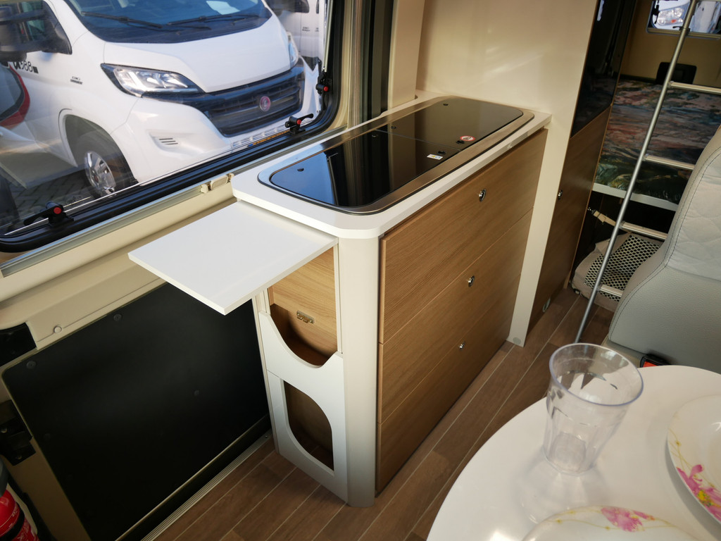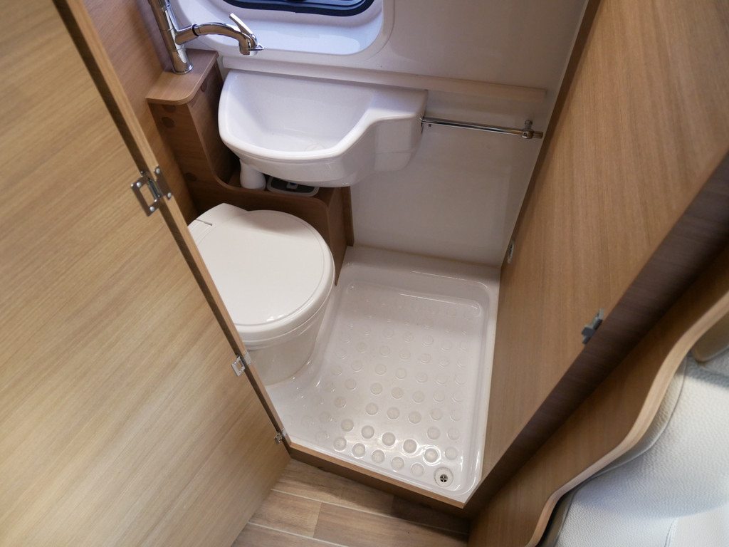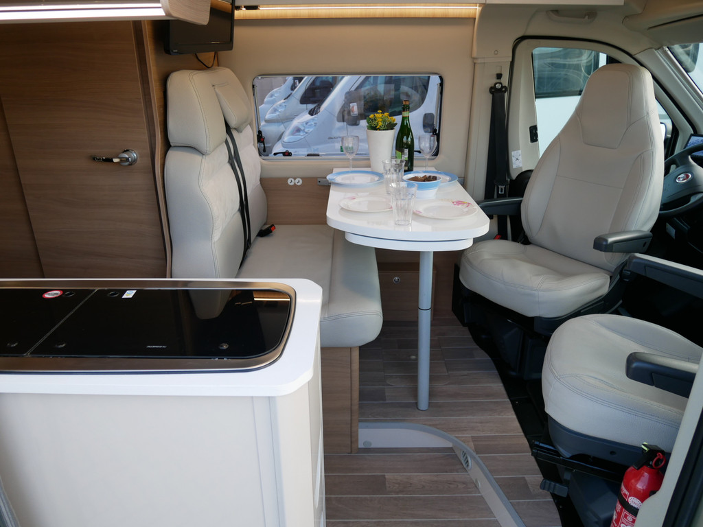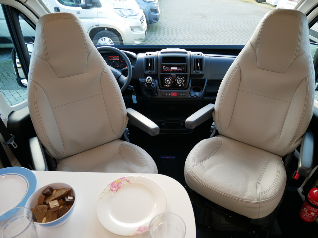 De camper is onder andere voorzien van een afwerking met lederen bekleding, keuken met 2 pits kooktoestel, stapelbed, cruise control, Truma kachel op diesel, boiler op diesel, koelkast, modern en licht ogende tinten in het interieur, wasbak, airco, zeer veel opbergmogelijkheden in de vele bovenkasten, toiletruimte met doucheruimte, een ruime zit met tafel en verduistering rondom.