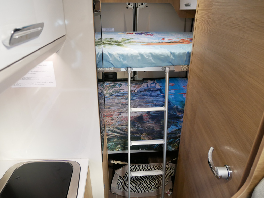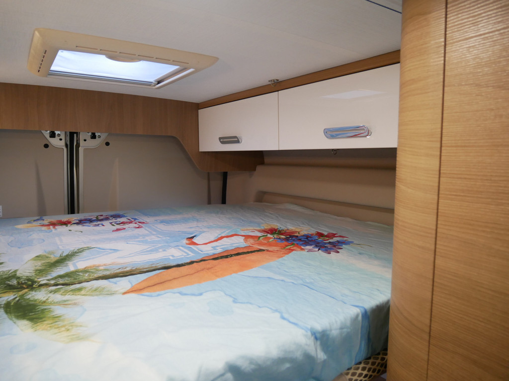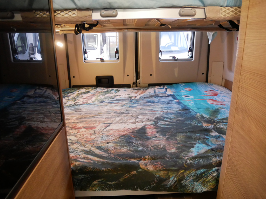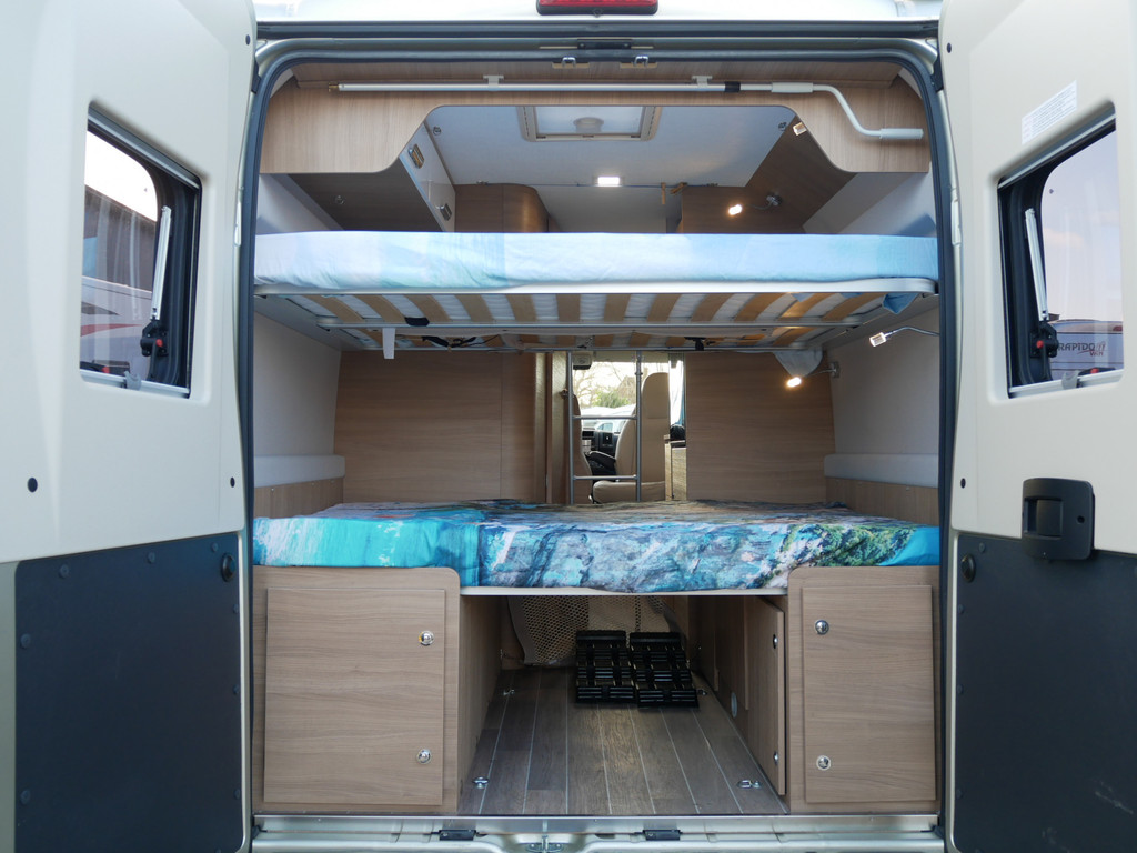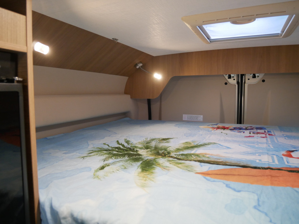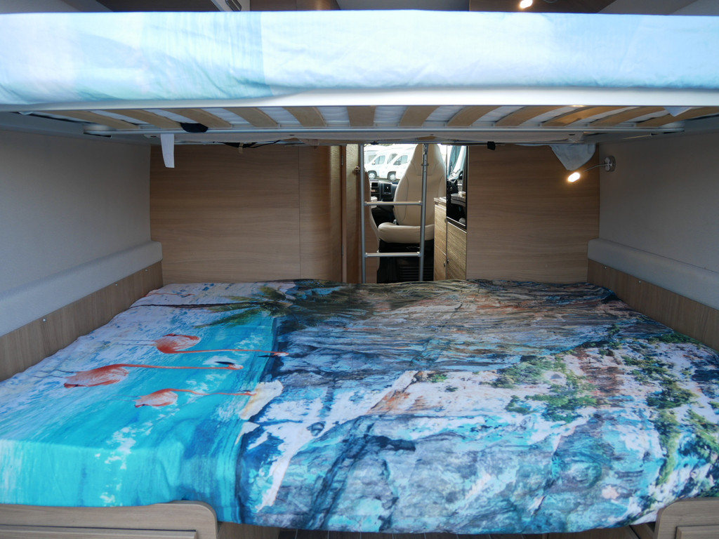 Maten: De camper heeft een stahoogte van 188 cm, dwarsbed onder 150 X 185 cm en dwarsbed boven 140 X 180 cm.