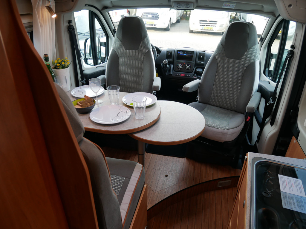 De camper is onder andere voorzien van een mooie afwerking met stoffen bekleding, luxe keuken met 2 pits kooktoestel, Truma kachel op gas, boiler, lichte moderne houttinten in het interieur, wasbak, motorairco, zeer veel opbergmogelijkheden door de vele kasten, toiletruimte met douche, radio/cd/mp-3 speler, verduistering rondom, een ruime zit met tafel en een metallic lak!