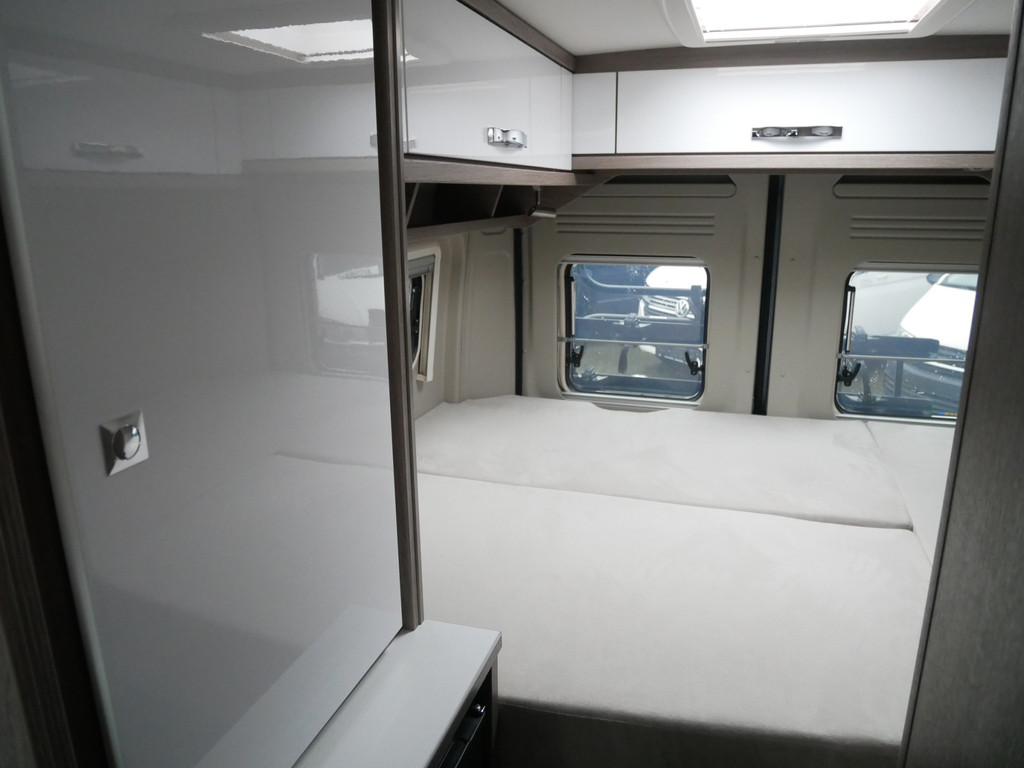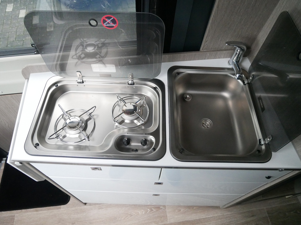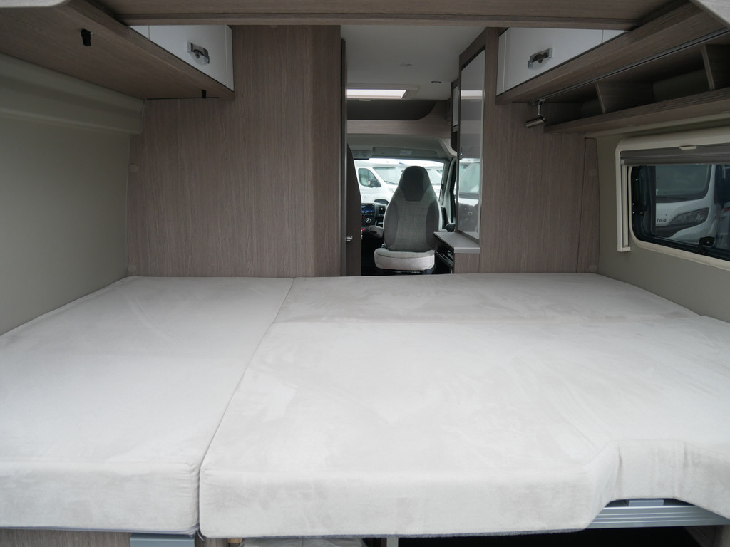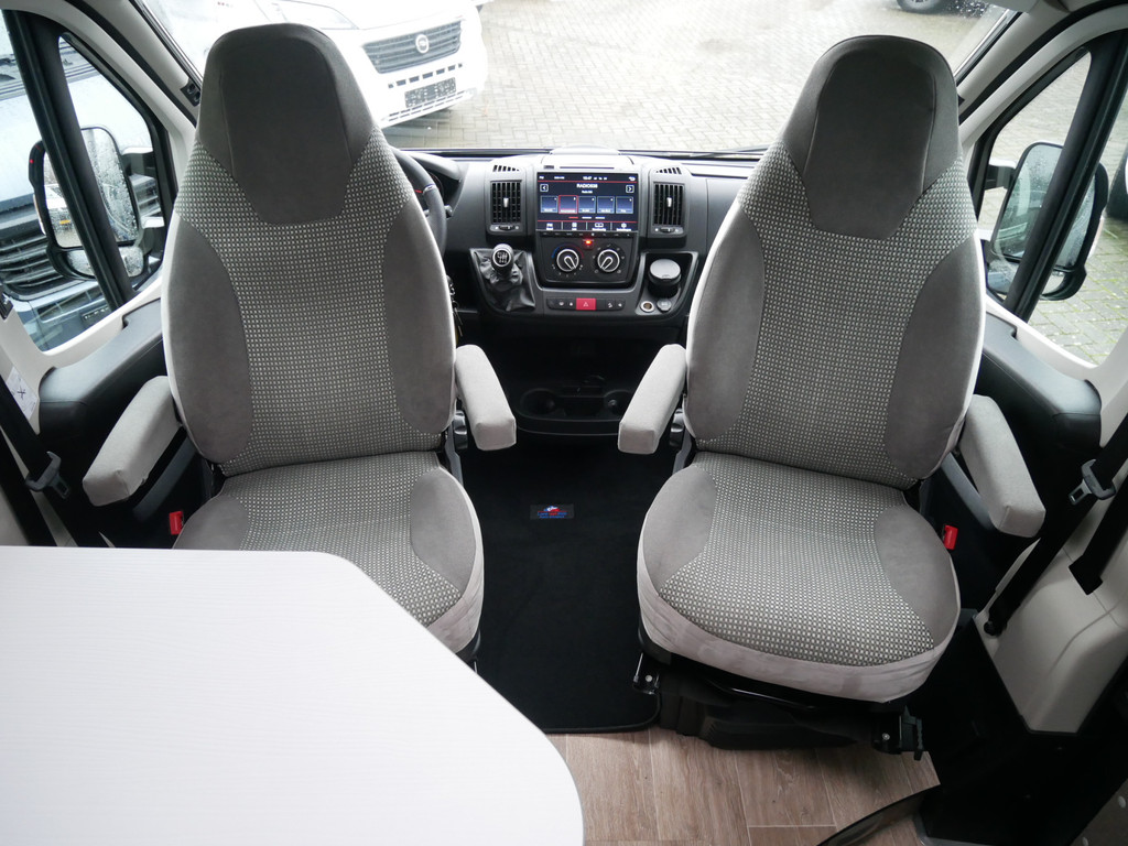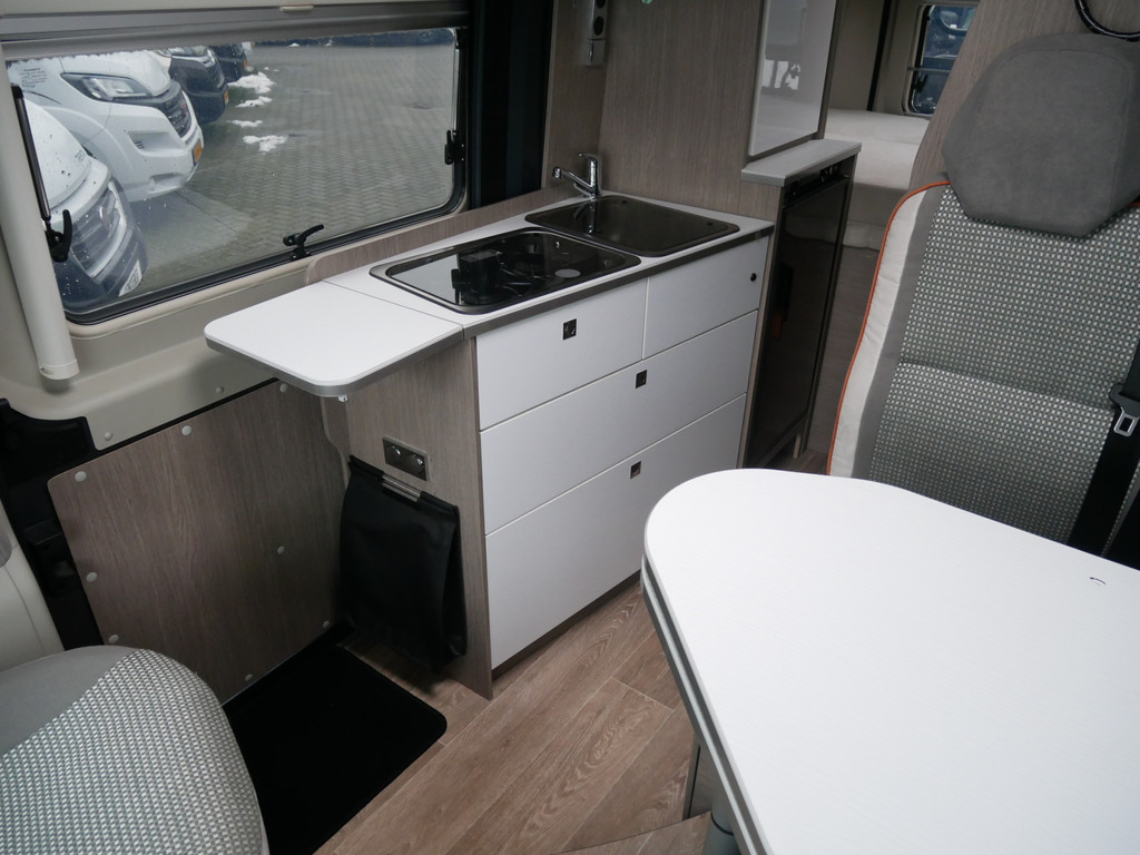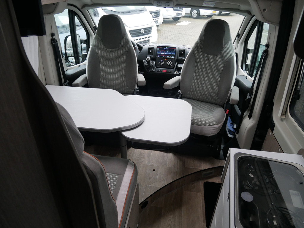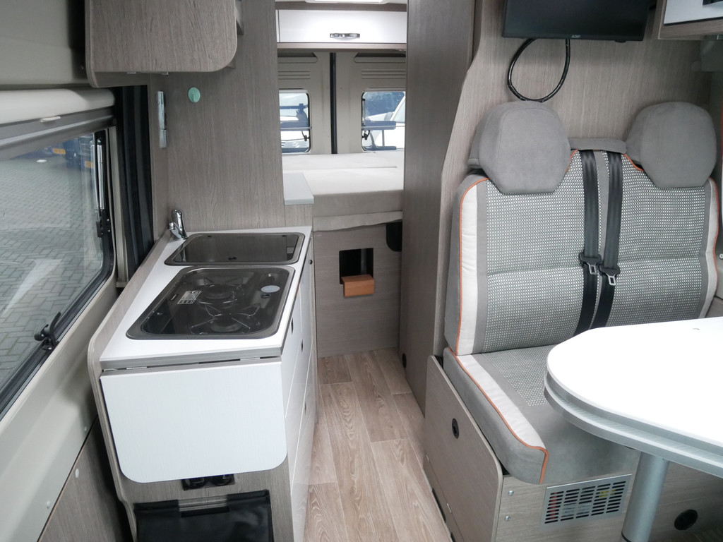 De camper is onder andere voorzien van een mooie afwerking met stoffen bekleding, luxe keuken met 2 pits kooktoestel, Truma kachel op gas, boiler op gas, koelkast, lichte houttinten in het interieur, wasbak, motorairco, toiletruimte met douche, radio/cd/mp-3 speler, bluetooth, metallic lak, dikke kwaliteit matrasstukken, rondom voorzien van vliegenhorren en verduistering rolgordijnen, een ruime trein zit welke gevormd kan worden door de draaibare voorstoelen en veel opberg mogelijkheden door het grote opbergruim onder het bed en de vele bovenkasten.