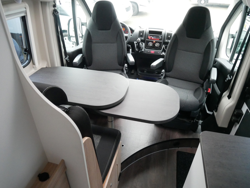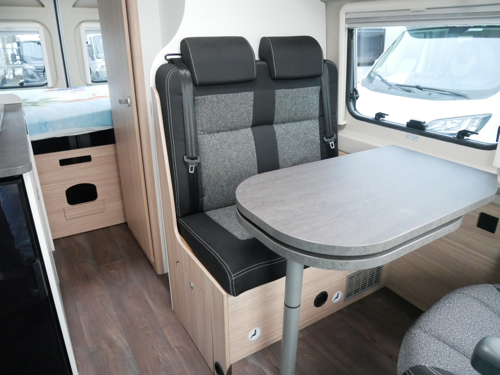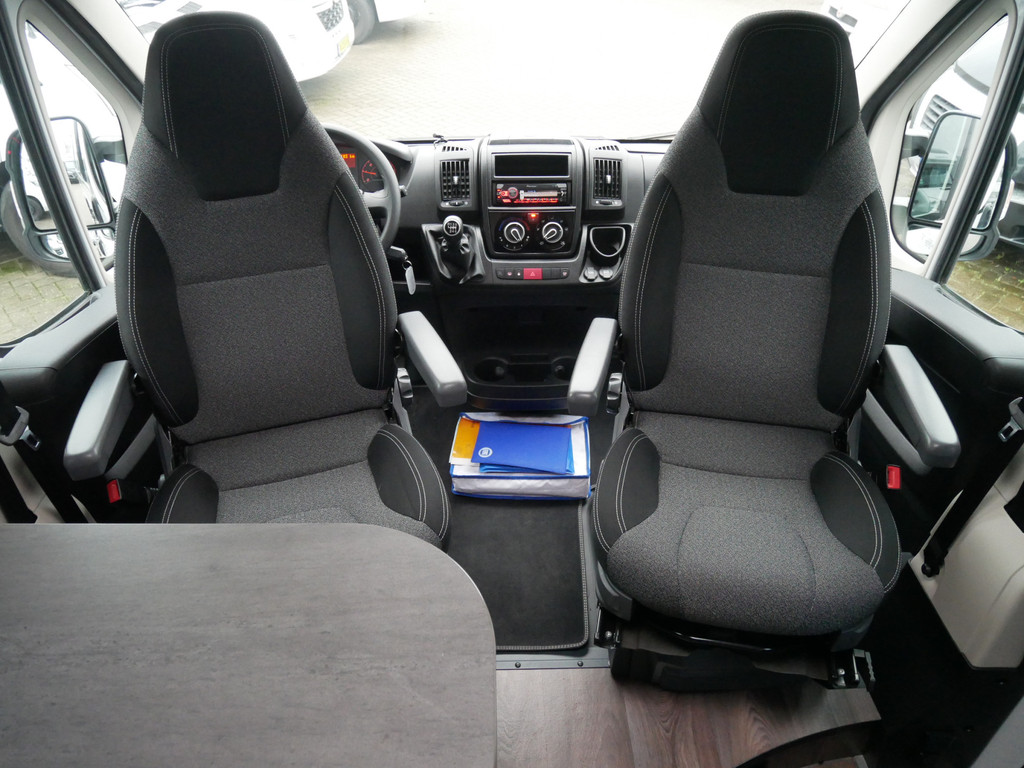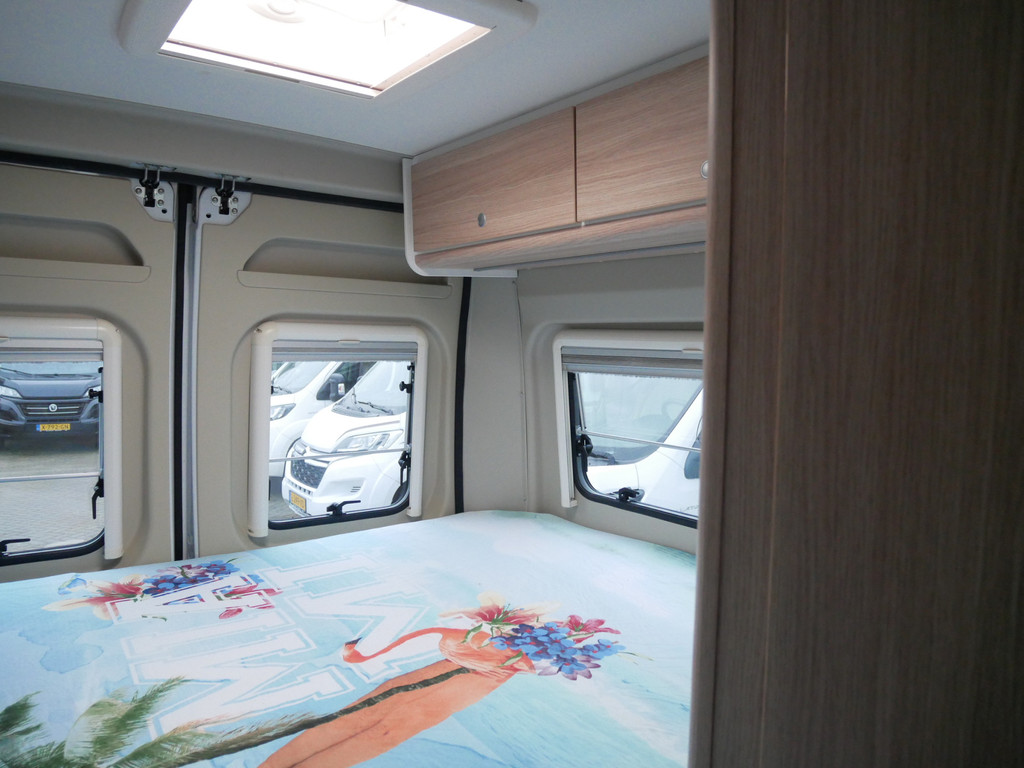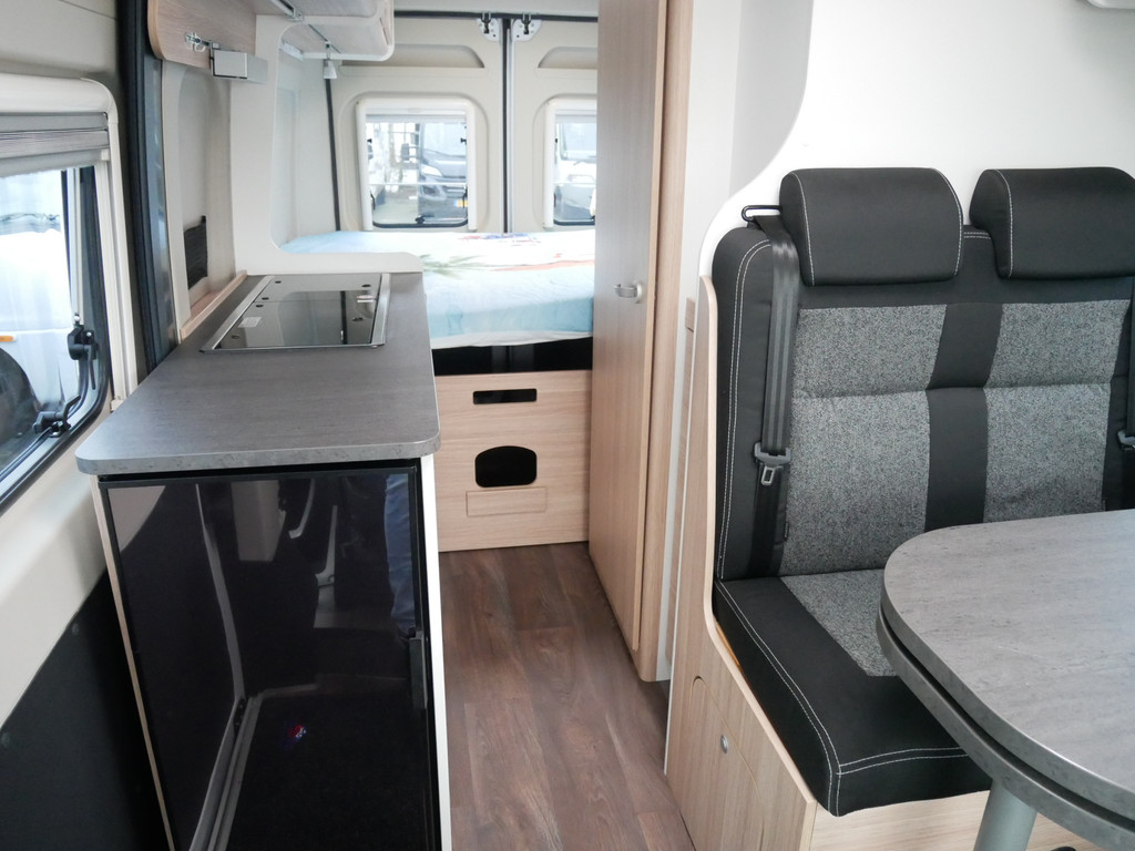 De camper is onder andere voorzien van een mooie afwerking met stoffen bekleding, keuken met 2 pits kooktoestel, dwarsbed, cruise control, Truma kachel op gas, boiler op gas, compressor koelkast, modern en luxe ogende tinten in het interieur, wasbak, motorairco, radio/mp-3 speler, bluetooth, zeer veel opbergmogelijkheden door de vele bovenkasten, toiletruimte met douche, een zit met tafel, verduistering en entree hordeur.