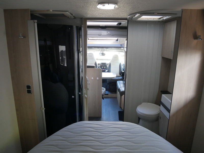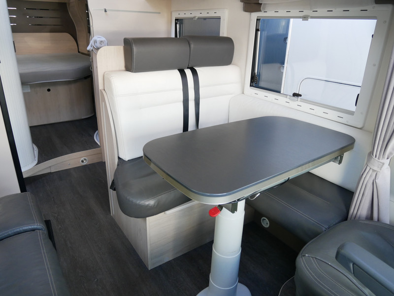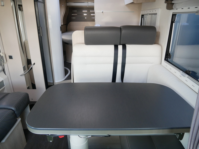 De camper is onder andere voorzien van een afwerking met lederen stoelen, 5 zitplaatsen, luxe en moderne look in het interieur, ruime keuken met 3 pits kooktoestel, in hoogte verstelbaar queensbed, elektrisch hefbed, wasbak, hordeur entree, radio/mp-3 speler, motorairco, zeer veel opbergmogelijkheden door de zeer vele bovenkasten en de grote kast ruimtes, ruime toiletruimte met douche ruimte, een ruime rondzit met grote tafel en mooie grote garage onder het queensbed.