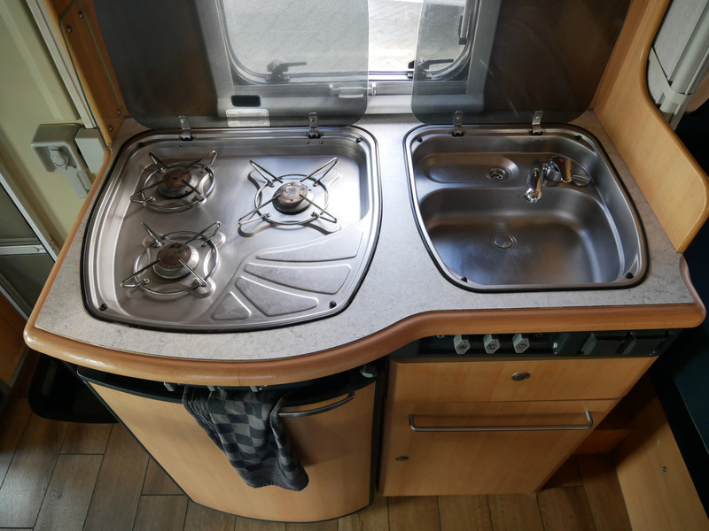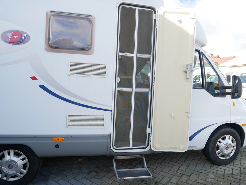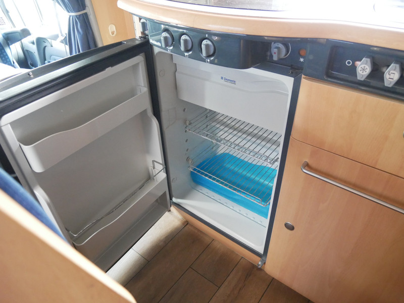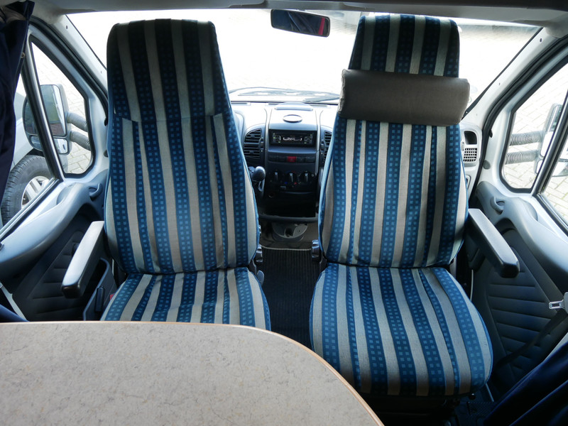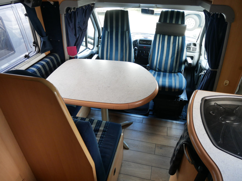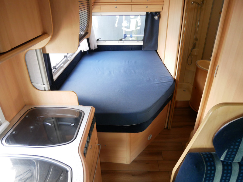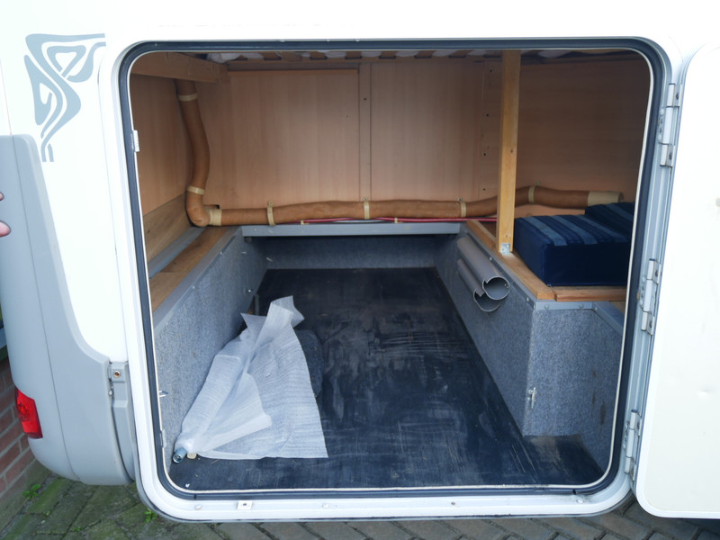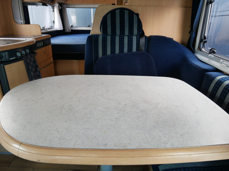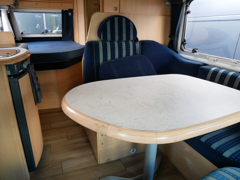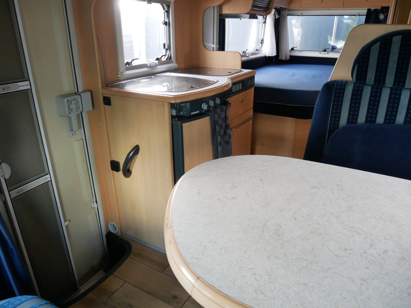De camper is onder andere voorzien van een nette afwerking met lichte stoffen bekleding, luifel, radio/cd/mp-3 speler, ruime keuken met 3 pits kooktoestel, mooie en lichte houttinten in het interieur, wasbak, hordeur entree, fransbed (140 X 195 cm), zeer veel opbergmogelijkheden in de vele bovenkasten en de grote kast ruimtes, ruime toiletruimte samen met een douche ruimte, een ruime treinzit met grote tafel en een grote garage met serviceluik aan de rechter buitenzijde.