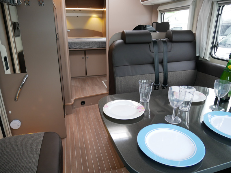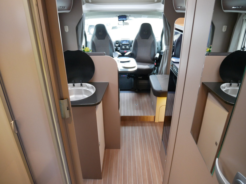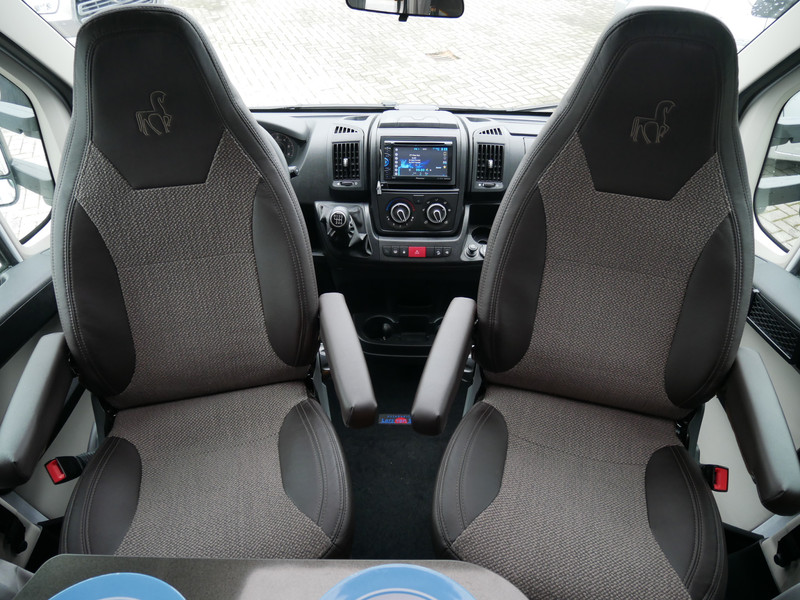 De camper is onder andere voorzien van een zeer mooie en luxe afwerking zoals half lederen stoelen, luxe en moderne look in het interieur, luxe ruime keuken met 3 pits kooktoestel, queensbed, hefbed, wasbak, hordeur entree, radio//mp-3 speler, motorairco, zeer veel opbergmogelijkheden in de vele bovenkasten en de grote kast ruimtes, ruime toiletruimte met douche ruimte, een ruime rondzit met grote tafel en mooie grote garage onder het queensbed.