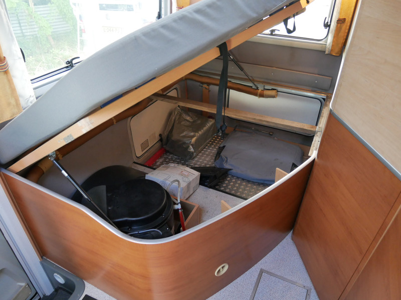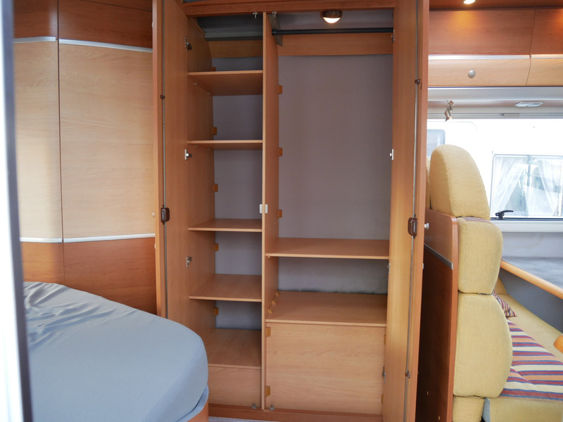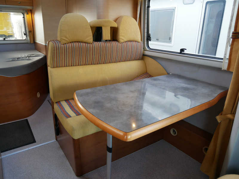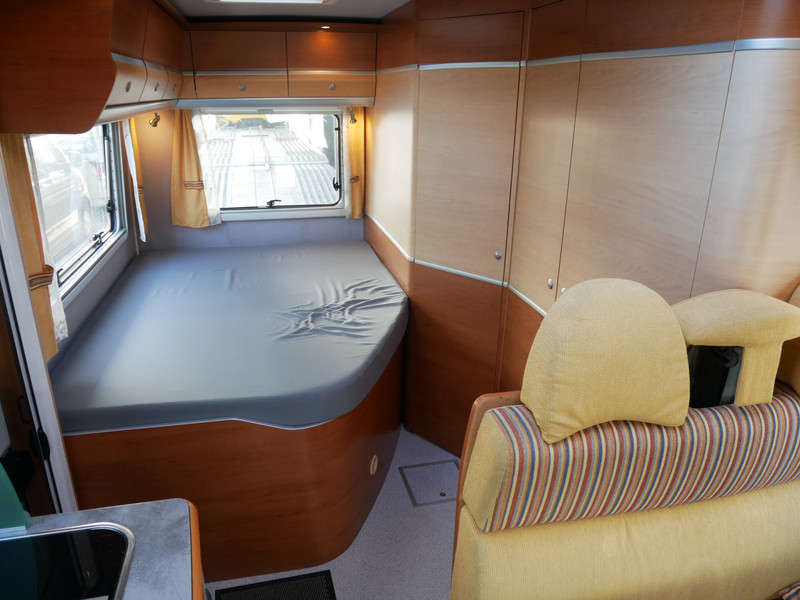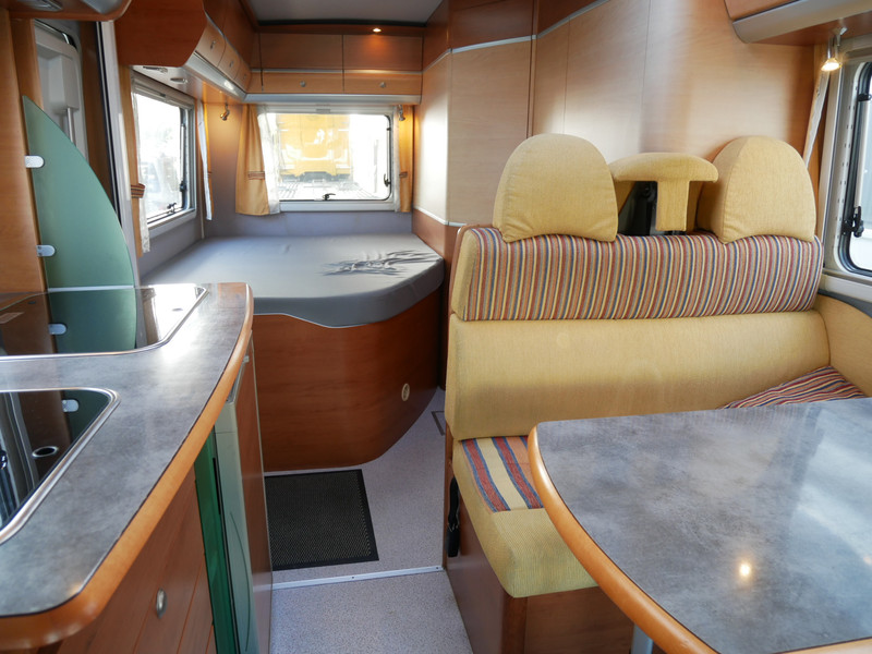 De camper is onder andere voorzien van een afwerking met stoffen bekleding, solide houten interieur, fransbed achterin, toilet en doucheruimte zijn gezamenlijk links achterin voorin een halve treinzit met 2 draaistoelen en een dwarsbankje, ruime keuken met 3 pits kooktoestel, wasbak, koelkast, heel veel opbergmogelijkheden door de vele bovenkasten en de grote kast ruimtes en garage onder het fransbed.