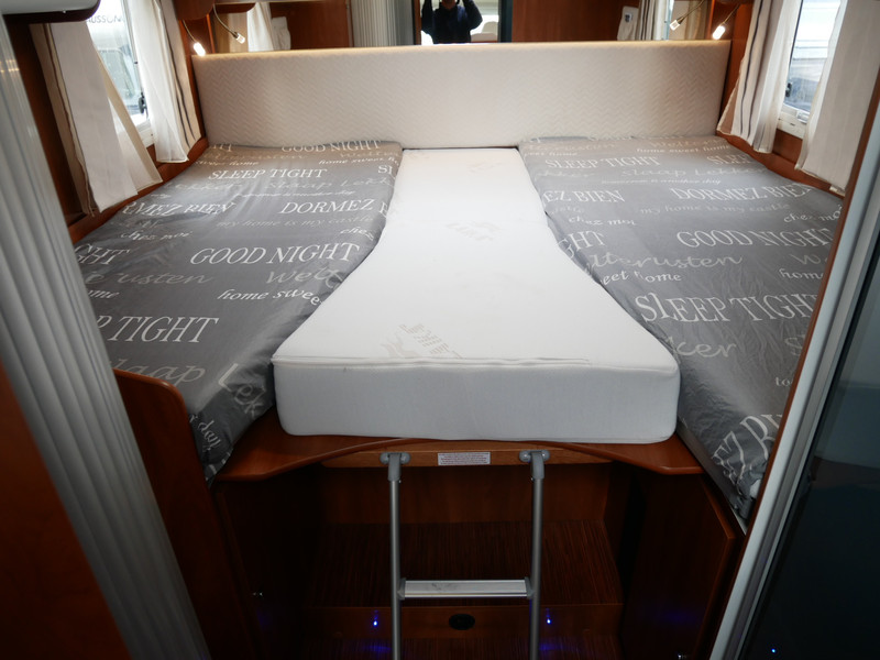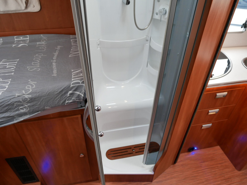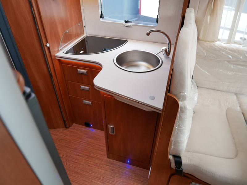 De camper is onder andere voorzien van een zeer mooie en luxe afwerking zoals stoffen stoelen, luxe en moderne look in het interieur, luxe ruime keuken met 3 pits kooktoestel, lengtebedden, groot hefbed, wasbak, hordeur entree, kwaliteitsvolle interieur, motorairco, zeer veel opbergmogelijkheden door de vele bovenkasten en de grote kast ruimtes, ruime toiletruimte met 2 ingangen, aparte douche ruimte, een ruime rondzit met grote tafel en mooie grote garage onder de lengtebedden (115 X 95 Cm deur).