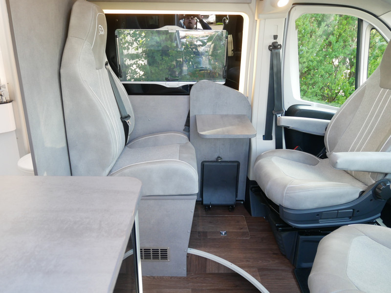 Houtdecor Mokka en stoffering Grigio Lucente voor een moderne en warme uitstraling, Easy Move tafelblad met reisfunctie voor extra flexibiliteit, Meer bewegingsvrijheid: Eén comfortabele stoel in plaats van een standaard bankje zorgt voor extra ruimte en bewegingsvrijheid in het interieur, Sfeervolle verlichting: De leefruimte is voorzien van sfeervolle verlichting, wat een warme en uitnodigende ambiance creëert, zowel overdag als ’s avonds, Multiroof: Biedt extra stahoogte of opbergruimte, afhankelijk van uw behoeften, Keuken met innovatieve koelkast: Meer werkoppervlak dankzij een opklapbaar werkblad voor extra functionaliteit, Badkamer met zwenkwand: Slimme indeling voor optimaal gebruik van de ruimte.