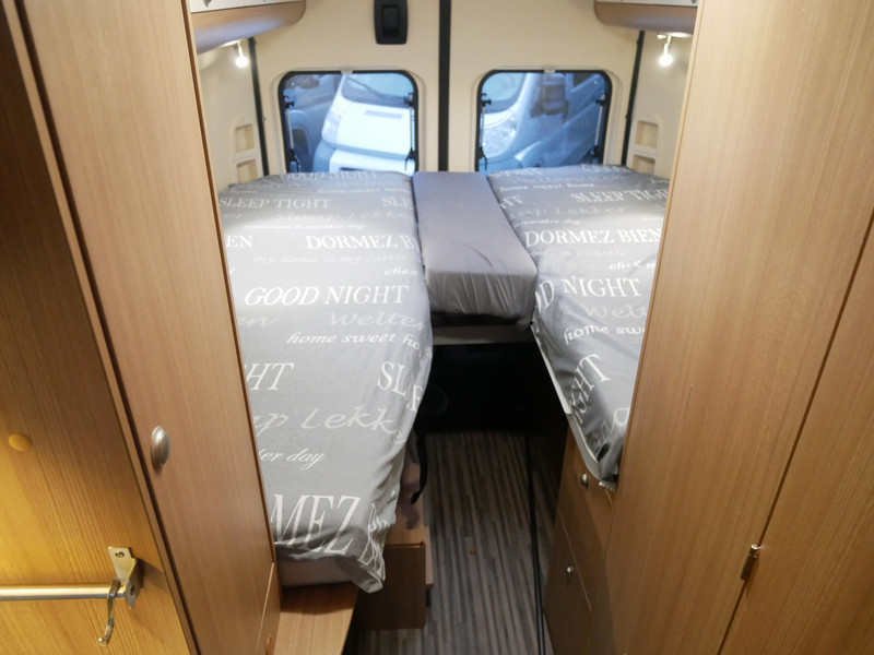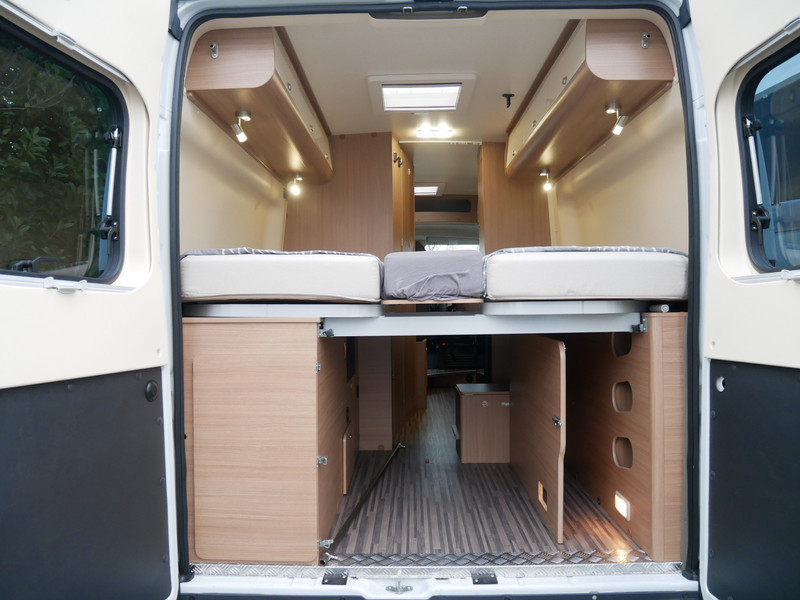 Maten: De camper heeft een stahoogte van 190 cm lengtebedden Links: 205 X 85 cm, Rechts 190 X 85 cm en Volledig 195 X 180 cm.